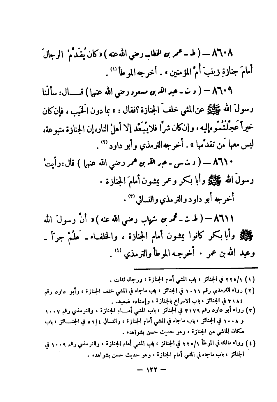 8610 - (د ت س) عبد الله بن عمر - رضي الله عنهما- قال: «رأيتُ رسولَ الله - صلى الله عليه وسلم- وأبا بكر وعمر يمشون أمامَ الجنازة» . أخرجه أبو داود والترمذي والنسائي (¬1) .