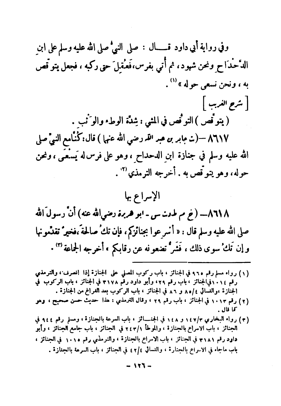 (¬1) رواه البخاري 3 / 147 و 148 في الجنائز، باب السرعة بالجنازة، ومسلم رقم (944) في الجنائز، باب الإسراع بالجنازة، والموطأ 1 / 243 في الجنائز، باب جامع الجنائز، وأبو داود رقم (3181) في الجنائز، باب الإسراع بالجنازة، والترمذي رقم (1015) في الجنائز، باب ما جاء في الإسراع بالجنازة، والنسائي 4 / 42 في الجنائز، باب السرعة بالجنازة.