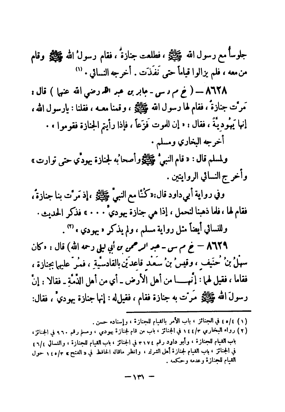 8629 - (خ م س) عبد الرحمن بن أبي ليلى - رحمه الله- قال: «كان سهْلُ بنُ حُنَيف، وقيسُ بنُ سَعْد قاعِدَيْن بالقادسَّيةِ، فمُرّ عليهما بجنازة، فقاما، فقيل لهما: إنَّها من أهل الأرض - أي من أهل الذِّمَّةِ - فقالا: إنَّ رسولَ الله - صلى الله عليه وسلم- مَرّت به جنازة فقام، فقيل له: إنها جنازة يهوديّ، فقال: -[132]- أليست نَفْساً؟» . أخرجه البخاري ومسلم والنسائي (¬1) .