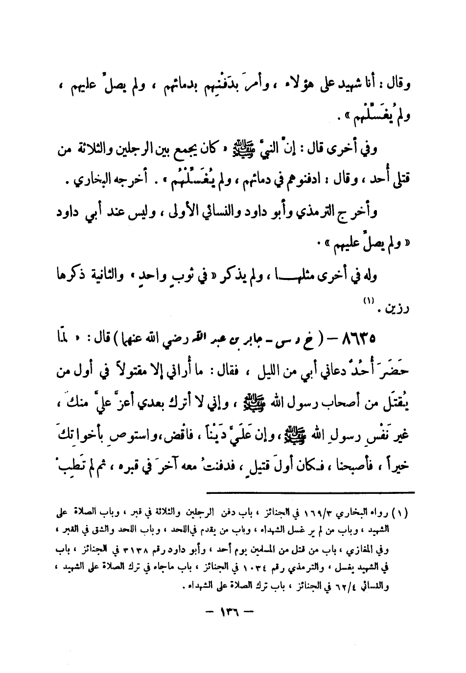 8635 - (خ د س) جابر بن عبد الله - رضي الله عنهما- قال: «لمَّا حَضَرَ أُحُد دعاني أبي من الليل، فقال: ما أُراني إلا مقتولاً في أول من يُقتَل من أصحاب رسول الله - صلى الله عليه وسلم-، وإني لا أترك بعدي أعزَّ عليَّ منكَ، غير نَفْسِ رسولِ الله - صلى الله عليه وسلم-، وإن عَلَيَّ دَيْناً، فاقْض، واستوصِ بأخواتِكَ خيراً، فأصبحنا، فكان أولَ قتيل، فدفنتُ معه آخرَ في قبره، ثم لم تَطِبْ -[137]- نفسي أن أتركه مع آخر، فاستخرجته بعد ستةِ أشهر، فإذا هو كيوم وضعتُه، غيرَ أُذُنِهِ» .