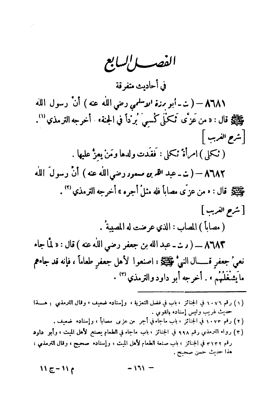 8682 - (ت) عبد الله بن مسعود - رضي الله عنه - أنَّ رسولَ الله - صلى الله عليه وسلم- قال: «من عزَّى مصاباً فله مثلُ أجره» أخرجه الترمذي (¬1) .