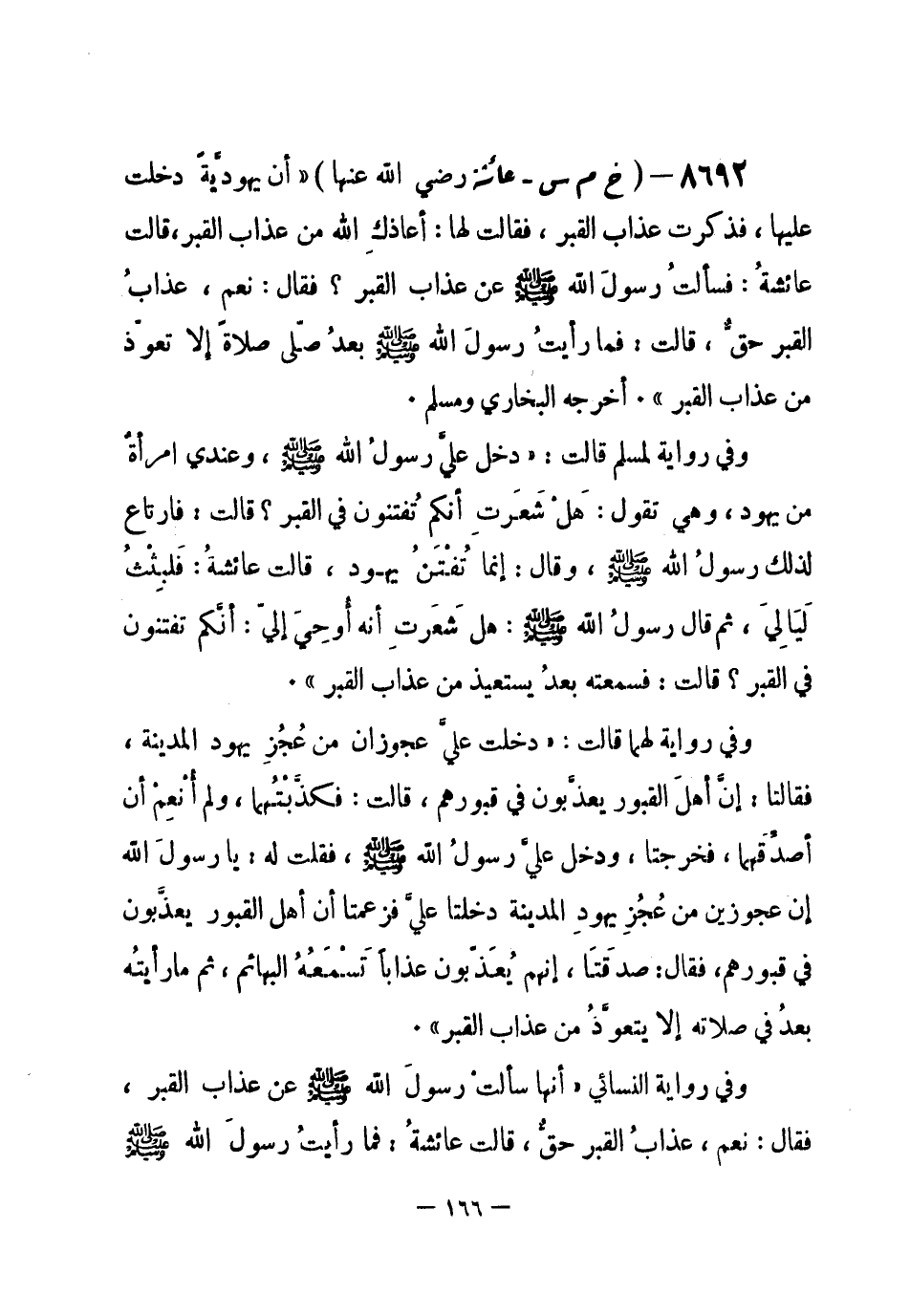 8692 - (خ م س) عائشة - رضي الله عنها- «أن يهوديَّة دخلت عليها، فذكرت عذاب القبر، فقالت لها: أعاذكِ الله من عذاب القبر، قالت عائشةُ: فسألتُ رسولَ الله - صلى الله عليه وسلم- عن عذاب القبر؟ فقال: نعم، عذابُ القبر حقّ، قالت: فما رأيتُ رسولَ الله - صلى الله عليه وسلم- بعدُ صَلى صلاة إلا تعوّذ من عذاب القبر» . أخرجه البخاري ومسلم.