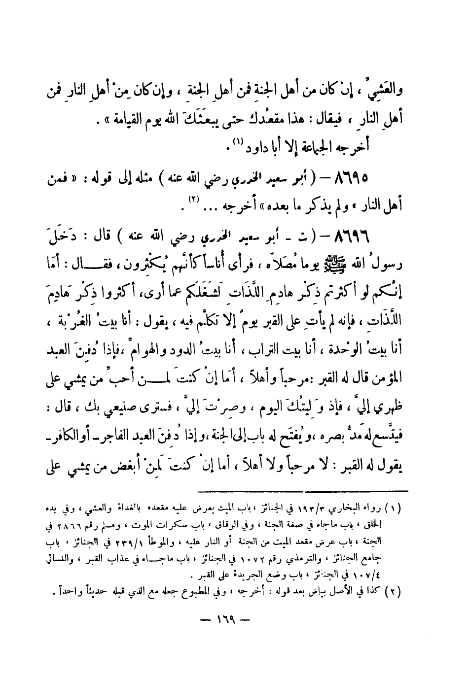 8696 - (ت) أبو سعيد الخدري - رضي الله عنه - قال: «دَخَلَ رسولُ الله - صلى الله عليه وسلم- يوماً مُصَلاّه، فرأى أُناساً كأنَّهم يُكْثِرون، فقال: أمَا إنَّكم لو أكثرتم ذِكْر هادِمَ اللَّذَاتِ لَشَغَلَكم عما أرى، أكثروا ذِكْر هَادِمَ اللَّذَاتِ، فإنه لم يأتِ على القبر يوم إلا تكلَّم فيه، يقول: أنا بيتُ الغُرْبة، أنا بيتُ الوْحدة، أنا بيت التراب، أنا بيتُ الدود والهوامِّ، فإذا دُفِنَ العبد المؤمن قال له القبر: مرحباً وأهلاً، أمَا إنْ كنتَ لمن أحبِّ من يمشي على ظهري إليَّ، فإذ وَلِيتُكَ اليوم، وصِرْتَ إليَّ، فسترى صنيعي بك، قال: فيتَّسع له مَدُّ بصره، ويُفتَح له باب إلى الجنة، وإذا دُفِنَ العبد الفاجر - أو الكافر - يقول له القبر: لا مرحباً ولا أهلاً، أما إنْ كنتَ لَمِنْ أبغض من يمشي على -[170]- ظهري إليَّ، فإذ وَليتُكَ اليومَ، وصِرْتَ إليَّ، فستري صنيعي بك، فالتأم عليه حتى تلتقي وتختلف أضلاعه، قال: وقال رسولُ الله - بأصابع يديه فشبَّكها - ثم يُقَيَّض له تسعون تِنِّيناً - أو قال: تسعةٌ وتسعون تنِّيناً - ولو أنَّ واحداً منها نفخ في الأرض ما أنبتتْ شيئاً ما بقيت الدنيا، فَتنْهَشُه وتَخْدِشه حتى يُبعثَ إلى الحساب، قال: وقال رسولُ الله - صلى الله عليه وسلم-: إنَّما القبرُ رَوضْةٌ من رياضِ الجنةِ، أو حُفرةٌ من حفرِ النار» .