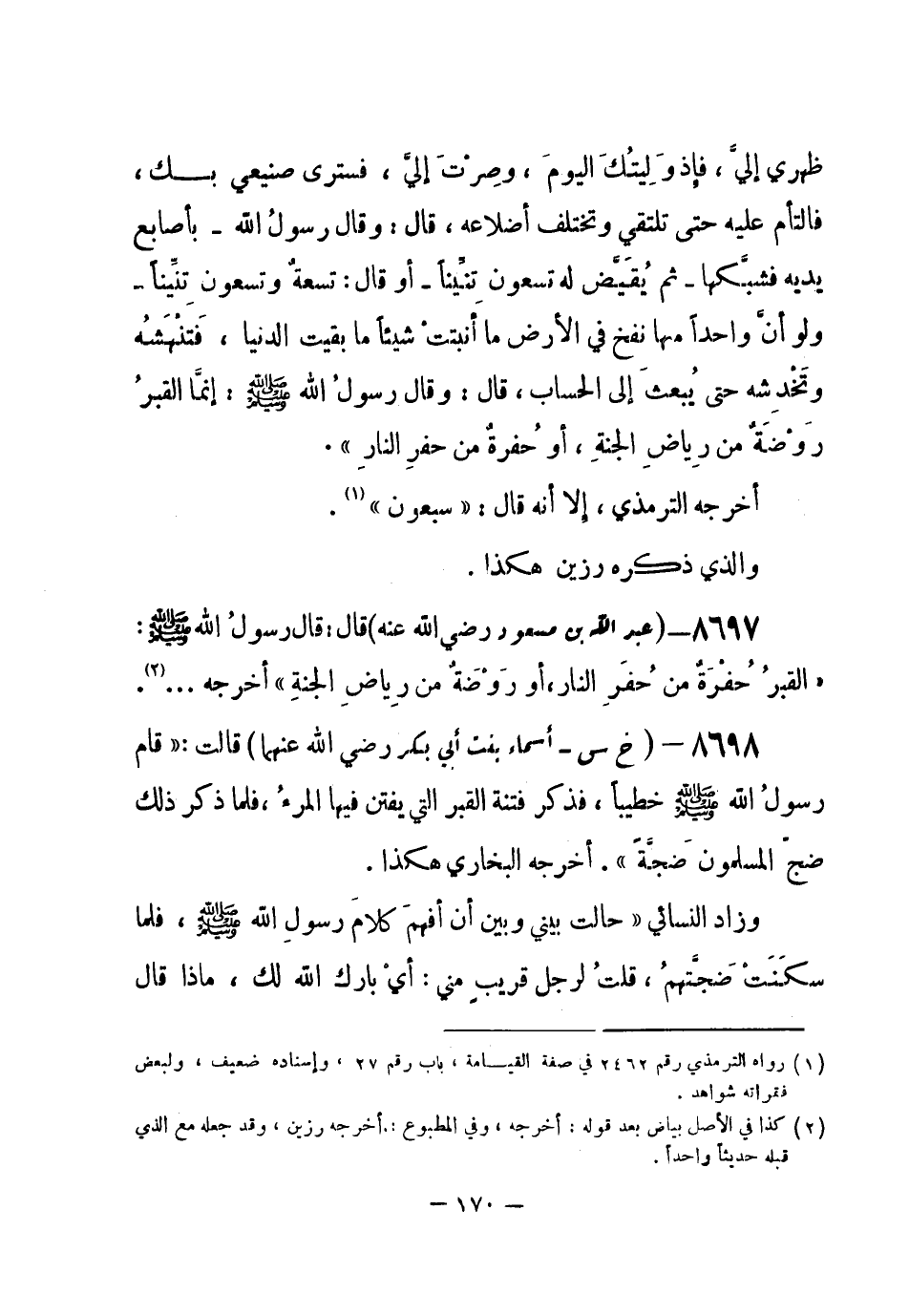 8697 - () عبد الله بن مسعود - رضي الله عنه - قال: قال رسولُ الله - صلى الله عليه وسلم-: «القبرُ حفْرَة من حُفَرِ النار، أو رَوْضَة من رياض الجنةِ» أخرجه ... (¬1) .