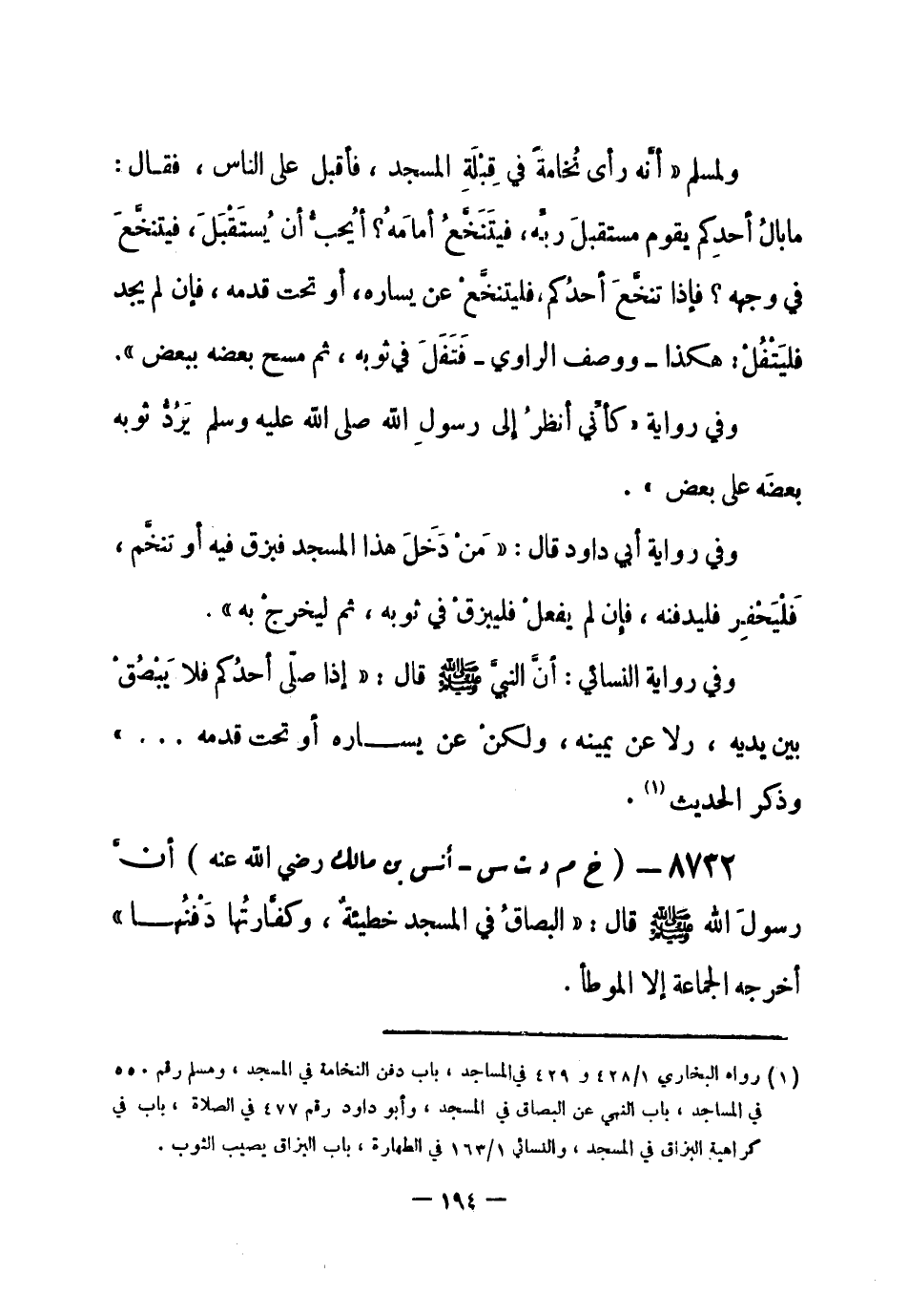 8732 - (خ م د ت س) أنس بن مالك - رضي الله عنه - أنَّ رسولَ الله - صلى الله عليه وسلم- قال: «البصاقُ في المسجد خطيئة، وكفَّارتُها دَفْنُها» أخرجه الجماعة إلا الموطأ. -[195]-