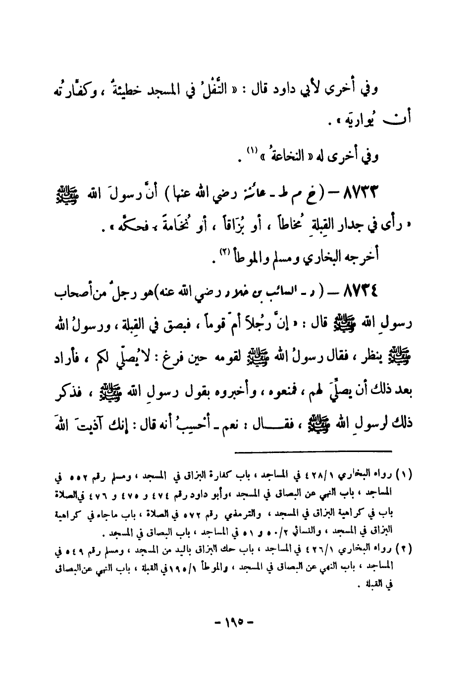8733 - (خ م ط) عائشة - رضي الله عنها- أنَّ رسولَ الله - صلى الله عليه وسلم- «رأى في جدار القِبلةِ مُخاطاً، أو بُزَاقاً، أو نُخَامة، فحكَّه» . أخرجه البخاري ومسلم والموطأ (¬1) .