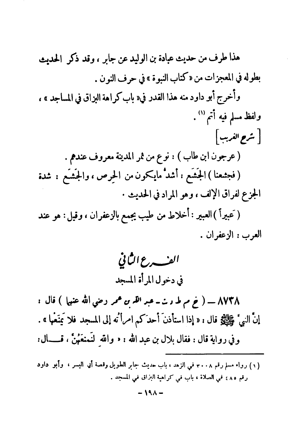 8738 - (خ م ط د ت) عبد الله بن عمر - رضي الله عنهما- قال: إنَّ النبيَّ - صلى الله عليه وسلم- قال: «إذا استأذنَ أحدَكم امرأتُه إلى المسجد فلا يَمنَعْها» .