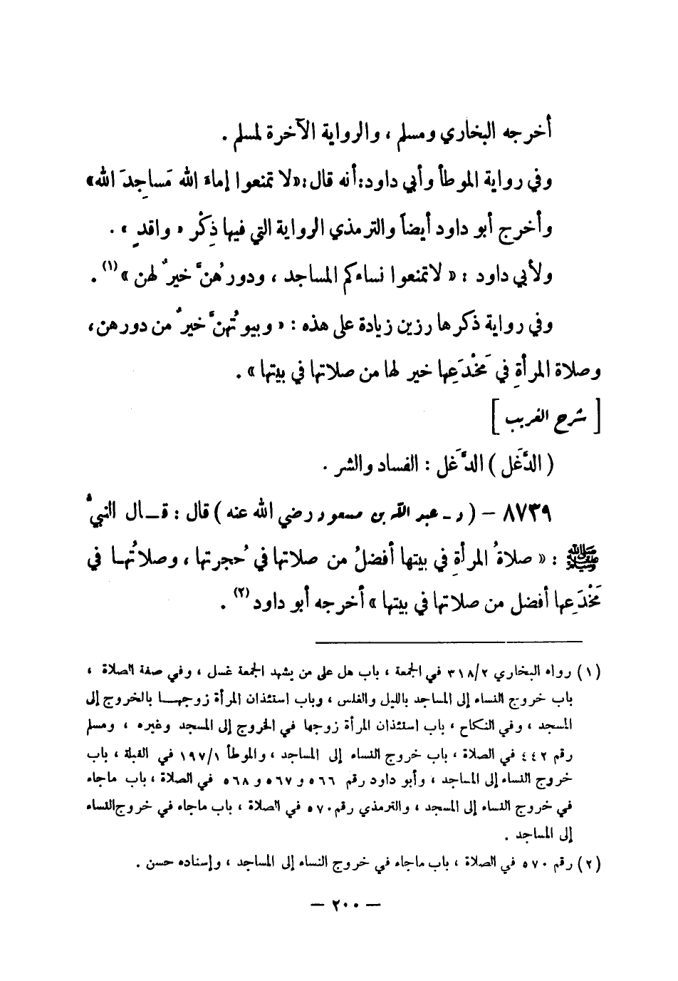 8739 - (د) عبد الله بن مسعود - رضي الله عنه - قال: قال النبيُّ - صلى الله عليه وسلم-: «صلاةُ المرأةِ في بيتها أفضلُ من صلاتها في حُجرتها، وصلاتُها في مَخْدَعِها أفضل من صلاتها في بيتها» أخرجه أبو داود (¬1) .
