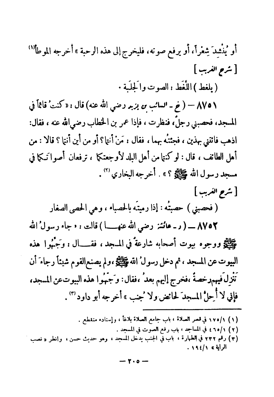 8751 - (خ) السائب بن يزيد - رضي الله عنه - قال: «كنتُ قائماً في المسجد، فحصبني رجل، فنظرت، فإذا عمر بن الخطاب - رضي الله عنه-، فقال: اذهب فائتني بهذين، فجئتُه بهما، فقال: مَنْ أنتما؟ أو من أين أنتما؟ قالا: من أهل الطائف، قال: لو كنتما من أهل البلد لأوجعتكما، ترفعان أصواتكما في مسجد رسول الله - صلى الله عليه وسلم-؟» . أخرجه البخاري (¬1) .