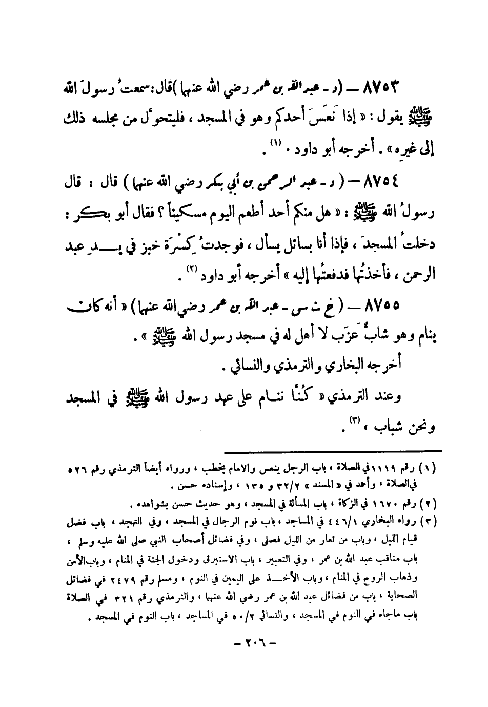 8755 - (خ ت س) عبد الله بن عمر - رضي الله عنهما- «أنه كان ينام وهو شاب عَزَب لا أهل له في مسجد رسول الله - صلى الله عليه وسلم-» .