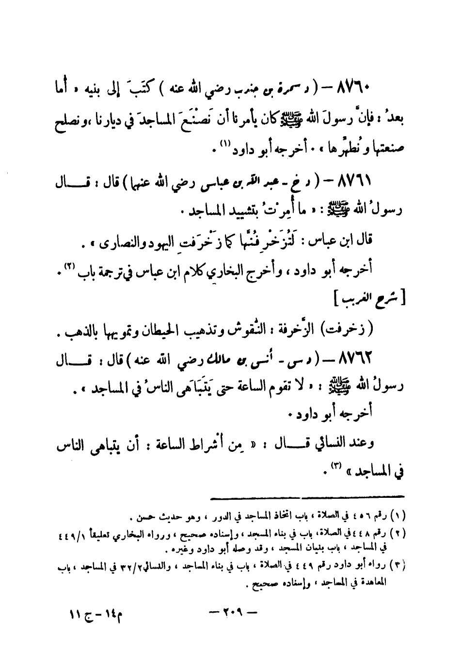 (¬1) رواه أبو داود رقم (449) في الصلاة، باب في بناء المساجد، والنسائي 2 / 32 في المساجد، باب المعاهدة في المساجد، وإسناده صحيح.