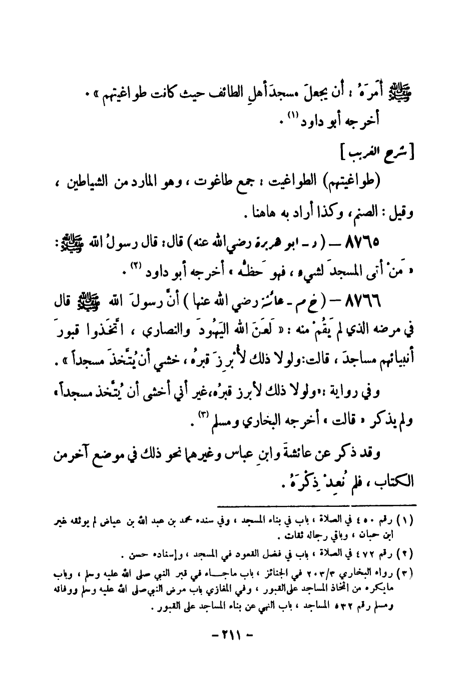(¬1) رواه البخاري 3 / 203 في الجنائز، باب ما جاء في قبر النبي صلى الله عليه وسلم، وباب ما يكره من اتخاذ المساجد على القبور، وفي المغازي، باب مرض النبي صلى الله عليه وسلم ووفاته، ومسلم رقم (532) في المساجد، باب النهي عن بناء المساجد على القبور.