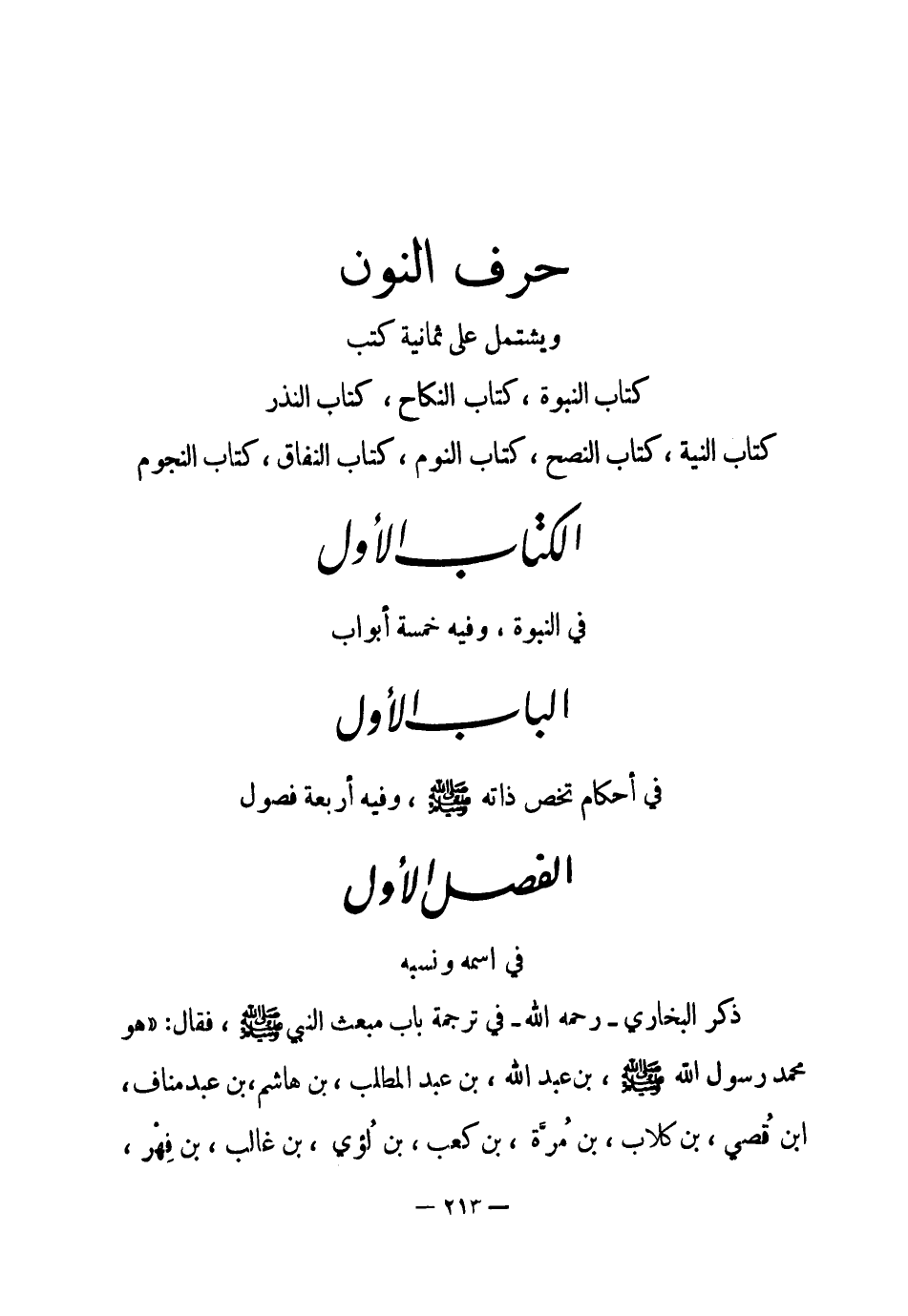 ذكر البخاري - رحمه الله - في ترجمة باب مبعث النبي - صلى الله عليه وسلم -، فقال: " هو محمد رسول الله - صلى الله عليه وسلم -، بن عبد الله، بن عبد المطلب، بن هاشم، بن عبد مناف، ابن قُصي، بن كلاب، بن مُرَّة، بن كعب، بن لُؤي، بن غالب، بن فِهْر، -[214]- ابن مالك، بن النضر، بن كنانة، بن خزيمة، بن مُدرِكة، بن إلياس، بن مُضَر، ابن نِزار، بن مَعدِّ، بن عدنان " (¬1) .