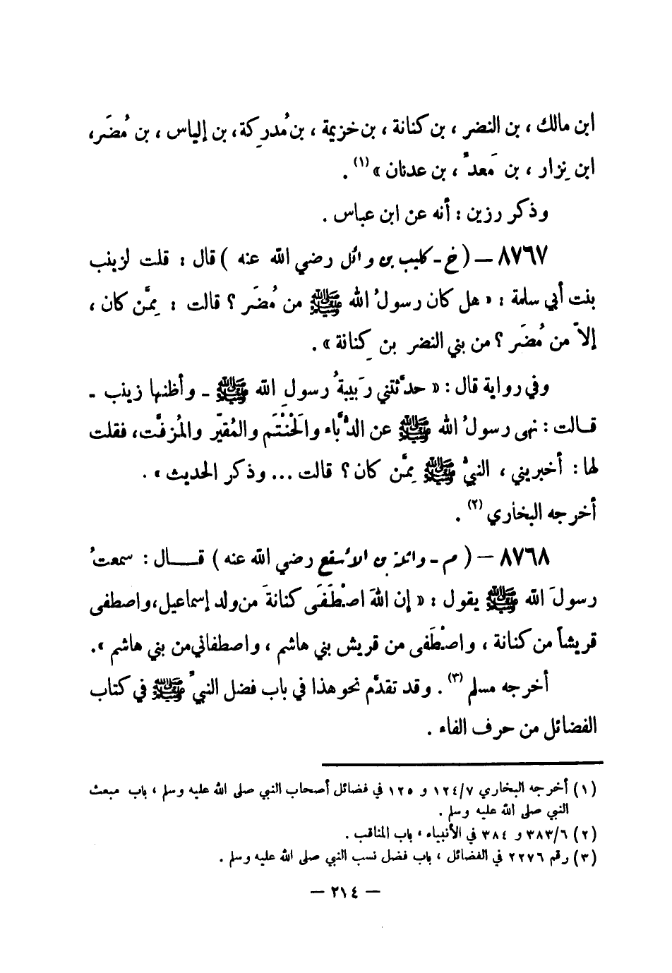 8768 - (م) واثلة بن الأسقع - رضي الله عنه - قال: سمعتُ رسولَ الله - صلى الله عليه وسلم- يقول: «إن الله اصطفى كنانة من ولد إسماعيل، واصطفى قريشاً من كنانة، واصطفى من قريش بني هاشم، واصطفاني من بني هاشم» .