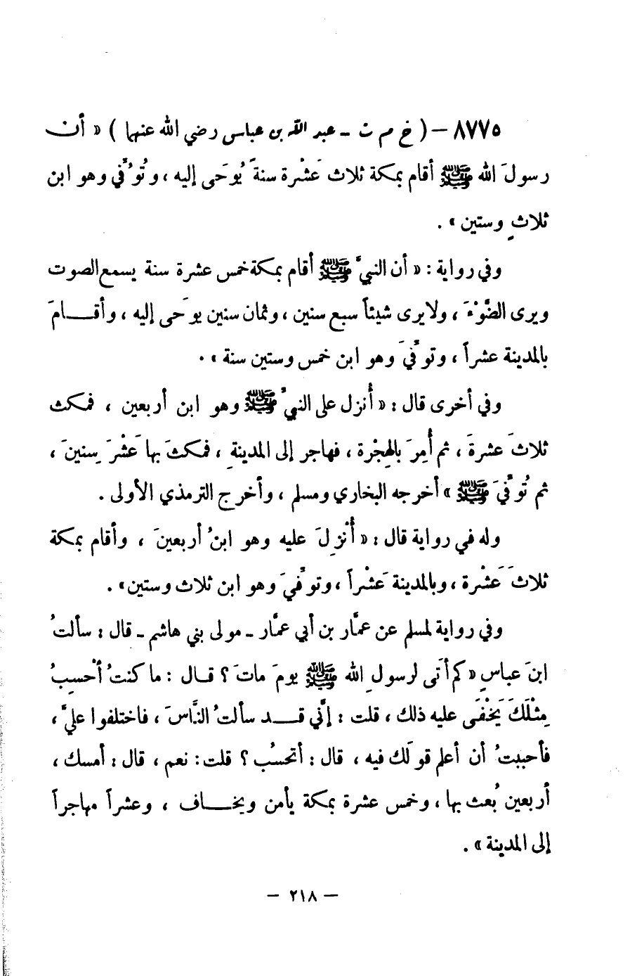 8775 - (خ م ت) عبد الله بن عباس - رضي الله عنهما - «أن رسول الله - صلى الله عليه وسلم- أقام بمكة ثلاث عَشْرة سنة يُوحَى إليه، وتُوُفِّي وهو ابن ثلاث وستين» .