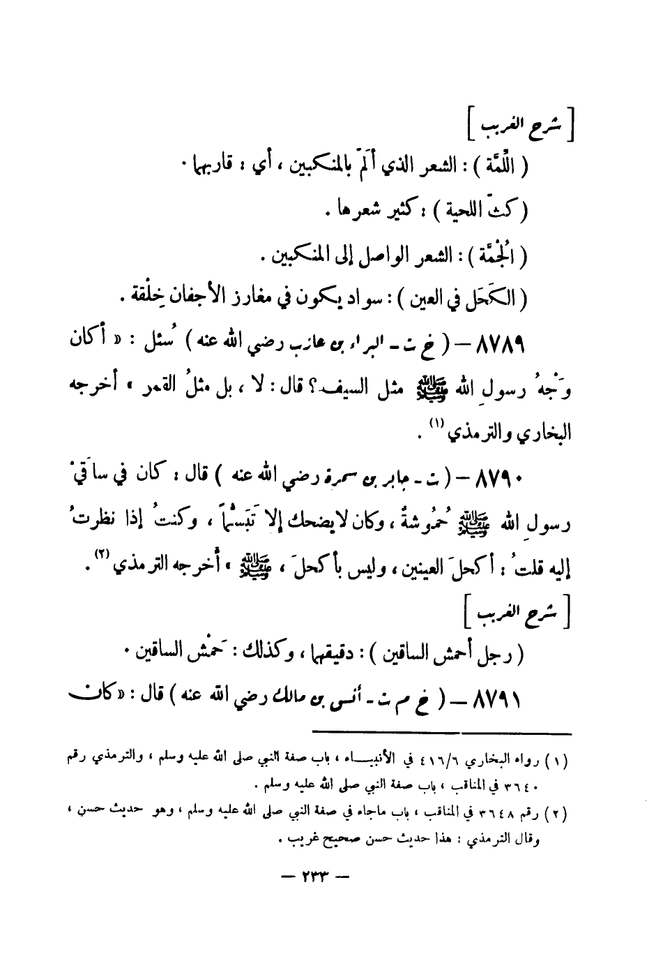 8790 - (ت) جابر بن سمرة - رضي الله عنه - قال: «كان في سَاقَيْ رسول الله - صلى الله عليه وسلم- حُمُوشة، وكان لا يضحك إِلا تَبَسُّماً، وكنتُ إذا نظرتُ إليه قلتُ: أكحل العينين، وليس بأكحل - صلى الله عليه وسلم-» أخرجه الترمذي (¬1) .