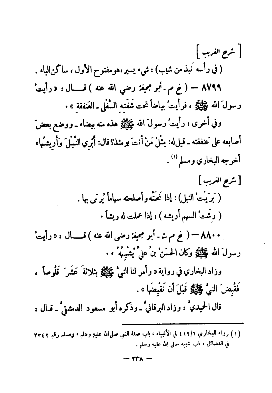 8799 - (خ م) أبو جحيفة - رضي الله عنه - قال: «رأيتُ رسول الله - صلى الله عليه وسلم-، فرأيتُ بياضاً تحت شَفَته السفلى - العنفقة» .