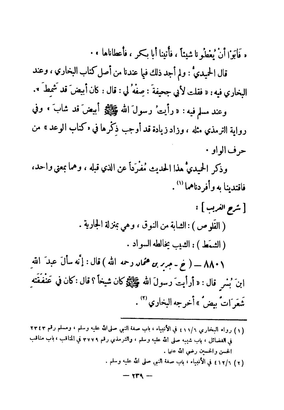 8801 - (خ) جرير بن عثمان - رحمه الله - قال: إنه سأل عبد الله بن بُسْر قال: «أرأيتَ رسول الله - صلى الله عليه وسلم- كان شيخاً؟ قال: كان في عنفقته شَعَرَات بيض» أخرجه البخاري (¬1) .