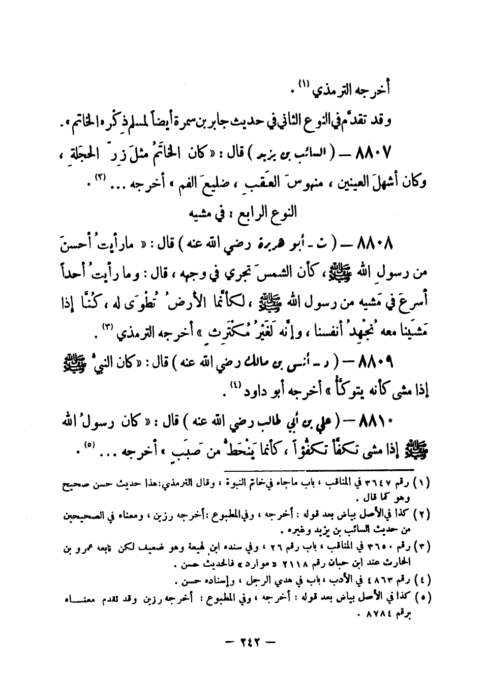 8810 - () علي بن أبي طالب - رضي الله عنه - قال: «كان رسول الله - صلى الله عليه وسلم- إذا مشى تكفّأ تكَفُّؤاً، كأنما يَنحَطُّ من صَبَب» أخرجه ... (¬1) .