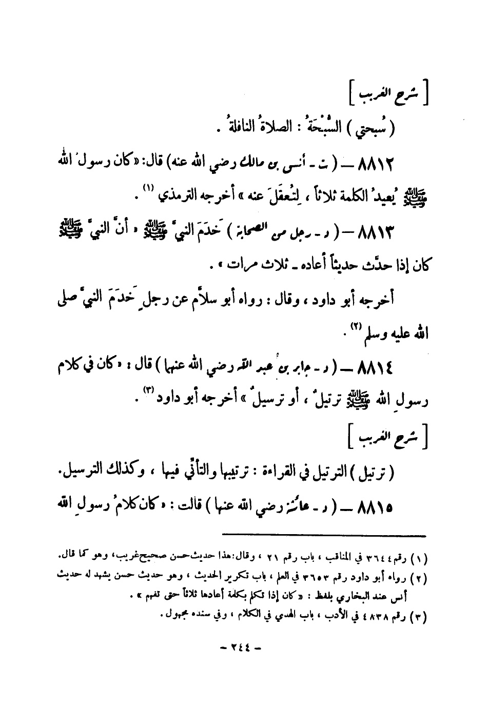 8812 - (ت) أنس بن مالك - رضي الله عنه - قال: «كان رسولُ الله - صلى الله عليه وسلم- يعيد الكلمة ثلاثاً، لِتُعقَلَ عنه» أخرجه الترمذي (¬1) .