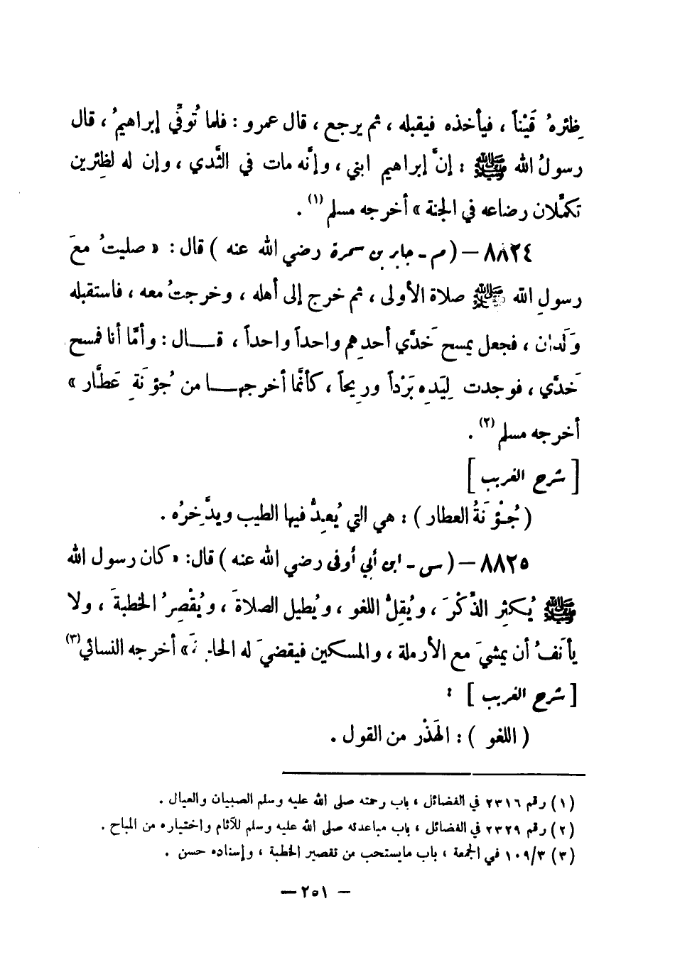 8824 - (م) جابر بن سمرة - رضي الله عنه - قال: «صليتُ مع رسول الله - صلى الله عليه وسلم- صلاة الأولى، ثم خرج إلى أهله، وخرجت معه، فاستقبله ولدان، فجعل يمسح خَدّي أحدهم واحداً واحداً، قال: وأما أنا فمسح خَدَّي، فوجدت لِيَدِه برداً وريحاً، كأنما أخرجها من جُؤنَةِ عَطَّار» أخرجه مسلم (¬1) .