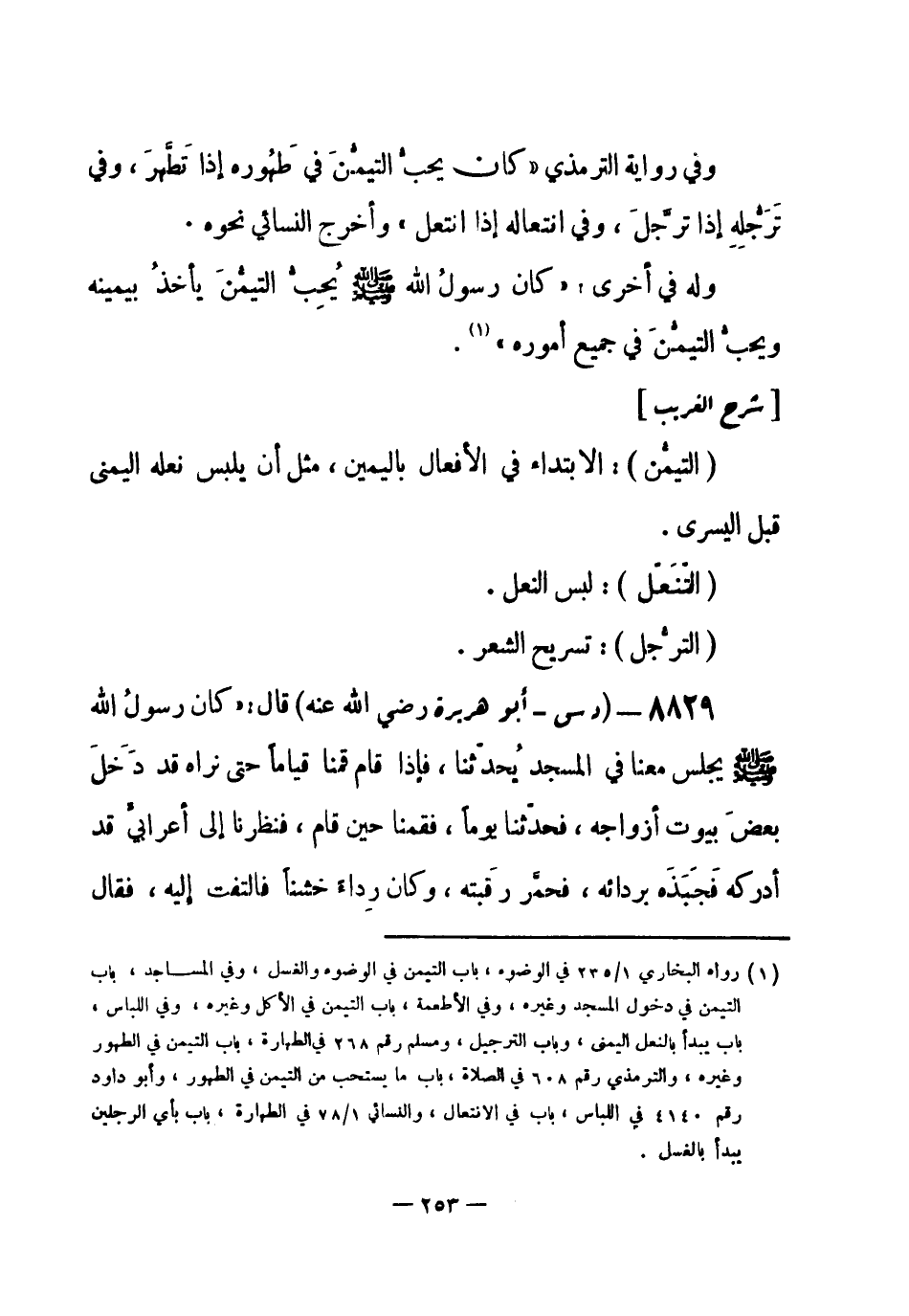 8829 - (د س) أبو هريرة - رضي الله عنه - قال: «كان رسولُ الله - صلى الله عليه وسلم- يجلس معنا في المسجد يُحدّثنا، فإذا قام قمنا قياماً حتى نراه قد دَخَلَ بعضَ بيوت أزواجه، فحدّثَنا يوماً، فقمنا حين قام، فنظرنا إلى أعرابي قد أدركه فَجَبَذَه بردائه، فحمرّ رقَبته، وكان رِداء خشناً فالتفت إِليه، فقال -[254]- الأعرابي: احملني على بعيريَّ هذين، فإنك لا تحملني من مالك، ولا من مال أبيك، فقال رسولُ الله - صلى الله عليه وسلم-: لا، وأستغفرُ الله، لا، وأستغفر الله، لا، وأستغفر الله، لا أحملك حتى تُقِيدَني من جَبْذَتِكَ التي جبذتني، فكل ذلك يقول الأعرابي: والله لا أقيدكها ... فذكر الحديث، قال: ثم دعا رجلاً فقال له: احمل له بعيريه هذين: على بعير شعيراً، وعلى الآخر تمراً، ثم التفت إلينا، فقال: انْصَرِفُوا على بركة الله عز وجل» أخرجه أبو داود.