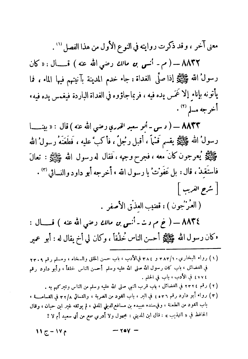 8833 - (د س) أبو سعيد الخدري- رضي الله عنه- قال: «بينا رسولُ الله - صلى الله عليه وسلم- يقسم قسماً، أقبل رجُل، فأكبّ عليه، فَطَعَنَهُ رسولُ الله - صلى الله عليه وسلم- بعُرْجون كان معه، فجرح وجهه، فقال له رسول الله - صلى الله عليه وسلم-: تعالَ فاستَقِدْ، قال: بل عَفَوْتُ يا رسول الله» أخرجه أبو داود والنسائي (¬1) .