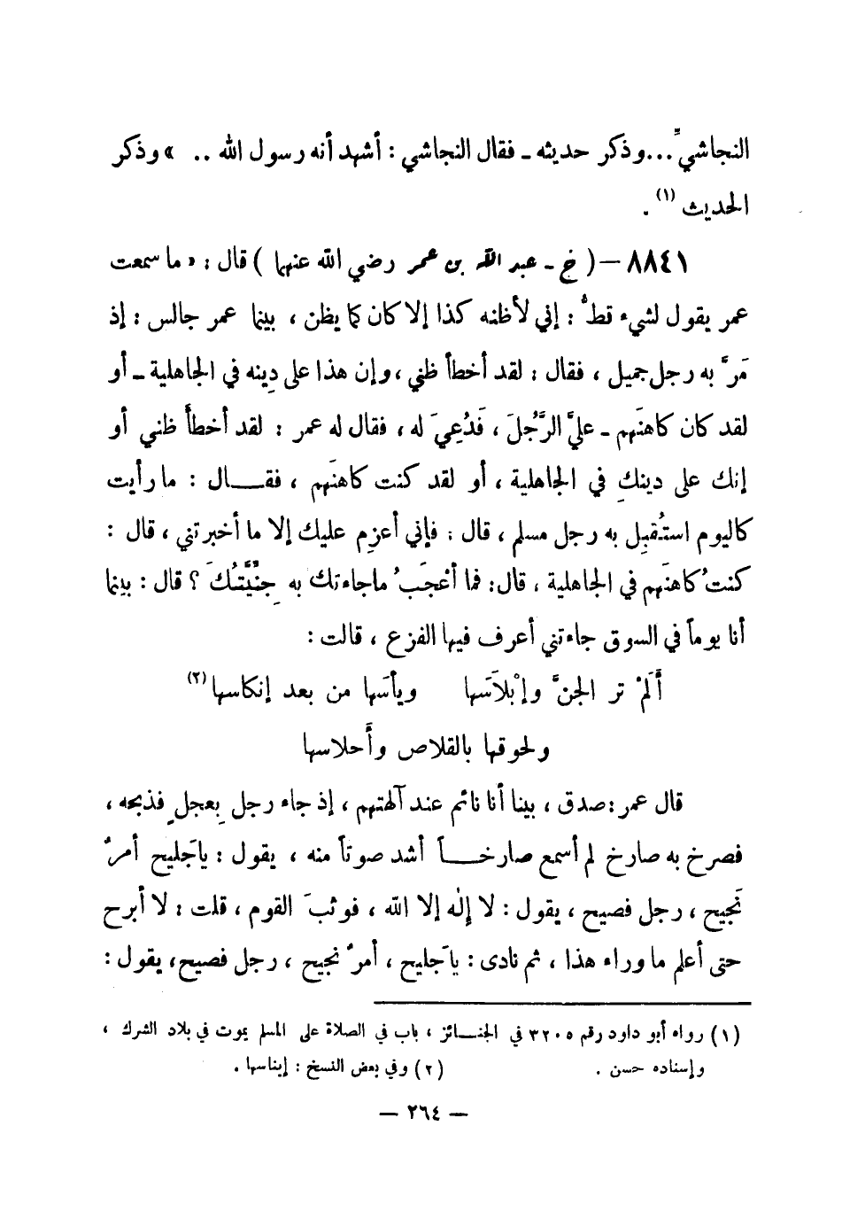 8841 - (خ) عبد الله بن عمر - رضي الله عنهما - قال: «ما سمعت عمر يقول لشيء قطُّ: إني لأظنه كذا إلا كان كما يظن، بينما عمر جالس: إذ مَرَّ به رجل جميل، فقال: لقد أخطأ ظني، وإن هذا على دِينه في الجاهلية - أو لقد كان كاهنهم - عليَّ الرَّجُلَ، فَدُعِيَ له، فقال له عمر: لقد أخطأ ظني أو إنك على دينك في الجاهلية، أو لقد كنت كاهنَهم، فقال: ما رأيت كاليوم استُقبِل به رجل مسلم، قال: فإني أعزِم عليك إلا ما أخبرتني، قال: كنت كاهنَهم في الجاهلية، قال: فما أعْجَبُ ما جاءتك به جِنيُّتك؟ قال: بينما أنا يوماً في السوق جاءتني أعرف فيها الفزع، قالت: