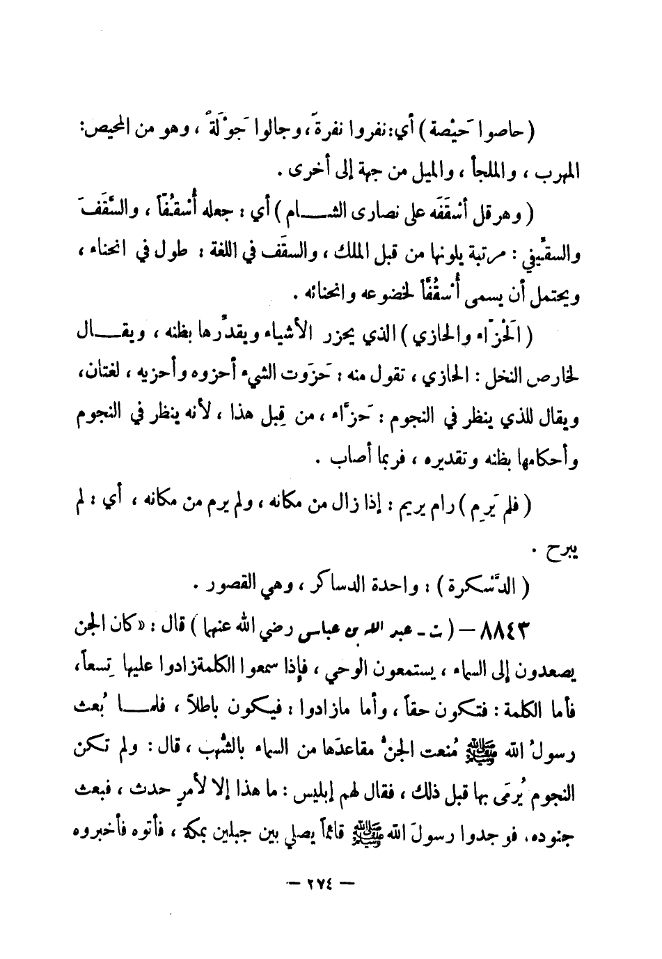 8843 - (ت) عبد الله بن عباس - رضي الله عنهما - قال: «كان الجن يصعدون إِلى السماء، يستمعون الوحي، فإِذا سمعوا الكلمة زادوا عليها تِسعاً، فأما الكلمة: فتكون حقاً، وأما ما زادوا: فيكون باطلاً، فلما بُعث رسول الله - صلى الله عليه وسلم- مُنعت الجنُّ مقاعِدَها من السماء بالشُّهب، قال: ولم تكن النجوم يُرمَى بها قبل ذلك، فقال لهم إِبليس: ما هذا إلا لأمرٍ حدث، فبعث جنوده، فوجدوا رسولَ الله - صلى الله عليه وسلم- قائماً يصلي بين جبلين بمكة، فأتوه فأخبروه، -[275]- فقال: هذا الحدَث الذي حَدَث في الأرض» أخرجه الترمذي (¬1) .