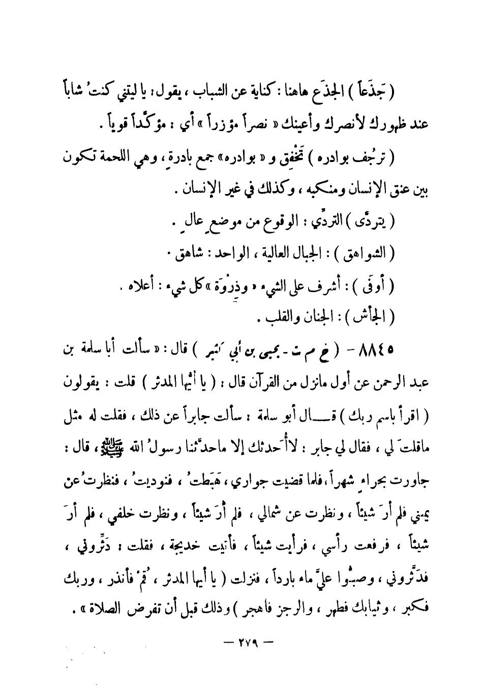 8845 - (خ م ت) يحيى بن أبي كثير قال: «سألت أبا سلمة بن عبد الرحمن عن أول ما نزل من القرآن قال: {يَا أَيُّها المُدثِّر} قلت: يقولون {اقْرأ باسمِ ربك} قال أبو سلمة: سألت جابراً عن ذلك، فقلت له مثل قلتَ لي، فقال لي جابر: لا أُحَدثك إلا ما حدثنا رسولُ الله - صلى الله عليه وسلم-، قال: جاورت بحراءٍ شهراً، فلما قضيت جواري، هَبَطت، فنوديت، فنظرتُ عن يميني فلم أرَ شيئاً، ونظرت عن شمالي فلم أر شيئاً، ونظرت خلفي، فلم أر شيئاً، فرفعت رأسي، فرأيت شيئاً، فأتيت خديجة، فقلت: دَثِّروني، فدَثَّروني، وصبُّوا عليَّ ماء بارداً، فنزلت {يَا أَيُّها المدثر. قُمْ فأَنذِر. ورَبَّكَ فكَبِّر. وثيابَكَ فطهر. والرجز فاهجُرْ} [المدثر: 1-5] وذلك قبل أن تفرض الصلاة» . -[280]-