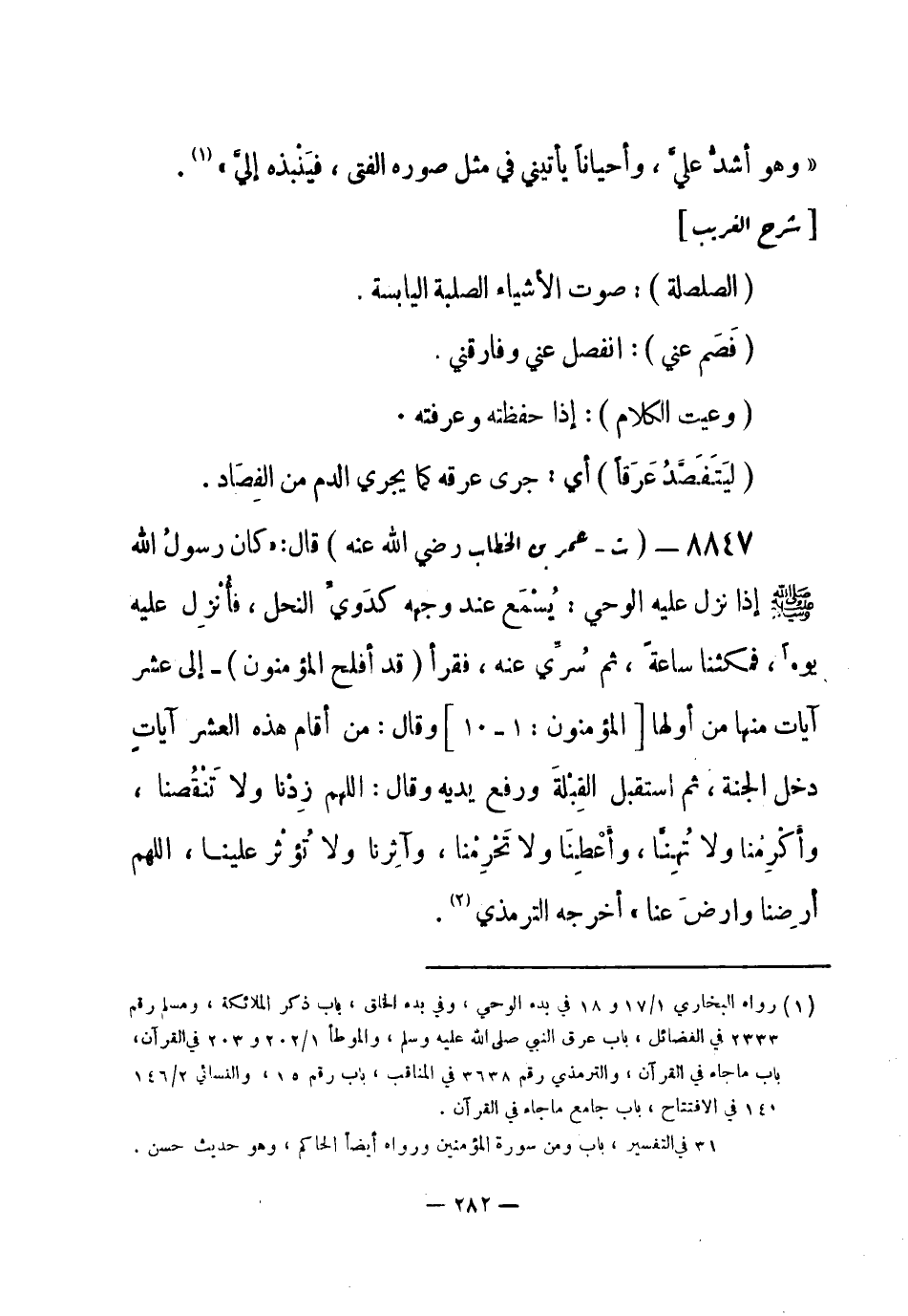 8847 - (ت) عمر بن الخطاب - رضي الله عنه - قال: «كان رسولُ الله - صلى الله عليه وسلم- إذا نزل عليه الوحي: يُسْمَع عند وجهه كدَوِيِّ النحل، فأُنْزِل عليه يوماً فمكثنا ساعة، ثم سُرِّي عنه، فقرأ: {قد أَفلَحَ المؤمنون} إلى عشر آيات منها من أولها [المؤمنون: 1-10] وقال: من أقام هذه العشر آيات دخل الجنة، ثم استقبل القِبْلة ورفع يديه وقال: اللهم زِدْنا ولا تنقصنا، وأكْرِمنا ولا تُهِنَّا، وأَعْطِنَا ولا تَحْرِمنا، وآثِرنا ولا تُؤثْر علينا، اللهم أرضِنا وارضَ عنا» أخرجه الترمذي (¬1) .