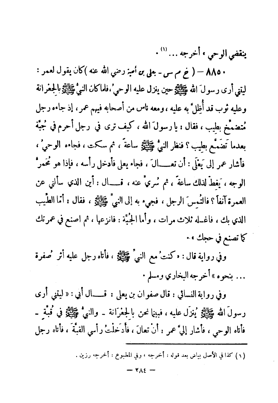 8850 - (خ م س) يعلى بن أمية - رضي الله عنه - كان يقول لعمر: «ليتني أرى رسول الله - صلى الله عليه وسلم- حين ينزل عليه الوحي، فلما كان النبي - صلى الله عليه وسلم- بالجِعرَّانة وعليه ثوب قد أُظِلَّ به عليه، ومعه ناس من أصحابه فيهم عمر، إذ جاءه رجل مُتضمِّخ بطِيب، فقال: يا رسول الله، كيف ترى في رجل أحرم في جُبَّة بعد ما تَضَمَّخ بطِيب؟ فنظر النبي - صلى الله عليه وسلم- ساعة، ثم سكت، فجاءه الوحيُ، فأشار عمر إلى يَعْلَى: أن تعال، فجاء يعلى فأدخل رأسه، فإذا هو مُحَمرُّ الوجه، يَغِطّ لذلك ساعة، ثم سُرّي عنه، قال: أين الذي سألني عن العمرة آنفاً؟ فالتُمِسَ الرجل، فجيء به إلى النبي - صلى الله عليه وسلم-، فقال: أمّا الطِّيب الذي بك فاغسله ثلاث مرات، وأما الجُبَّة: فانزعها، ثم اصنع في عمرتك كما تصنع في حجك» .