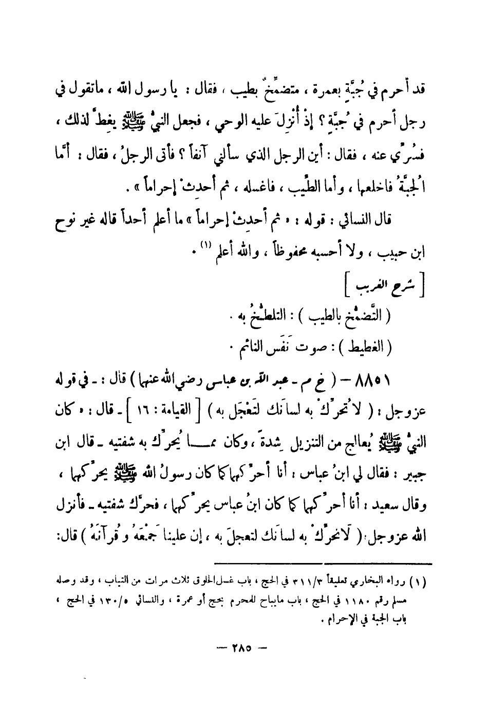 8851 - (خ م) عبد الله بن عباس - رضي الله عنهما – قال: - في قوله عز وجل {لا تُحرِّكْ به لِسانَكَ لتَعْجَل به} [القيامة: 16]- قال: «كان النبي - صلى الله عليه وسلم- يُعالج من التنزيل شِدة، وكان مما يُحرِّك به شفتيه - قال ابن جبير: فقال لي ابن عباس: أنا أحرِّكهما كما كان رسول الله - صلى الله عليه وسلم- يحرِّكهما، وقال سعيد: أنا أحرِّكهما كما كان ابنُ عباس يحرِّكهما، فحرَّك شفتيه - فأنزل الله عز وجل: {لا تُحَرِّك به لسانَكَ لتعجلَ به. إِن علينا جَمْعَهُ وقُرآنَهُ} قال: -[286]- جمعَه في صدرك، ثم تقرؤه، {فإذا قرأناه فاتّبع قرآنه} قال: فاستمع [له] وأنصت {ثم إنَّ علينا} [ثم إن علينا] أن تقرأه، قال: فكان رسولُ الله - صلى الله عليه وسلم- إذا أتاه جبريل بعد ذلك استمع، فإذا انطلق جبريل قرأه النبي - صلى الله عليه وسلم- كما أقرأه» .