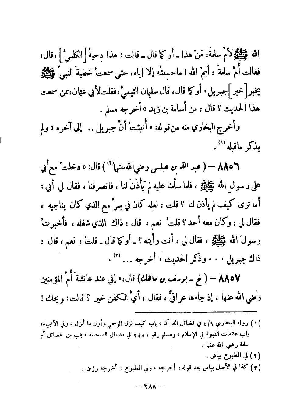 8856 - () عبد الله بن عباس رضي الله عنهما (¬1) قال: «دخلتُ مع أبي على رسول الله - صلى الله عليه وسلم- فلما سلمنا عليه لم يأذن لنا، فانصرفنا، فقال لي أبي: أما ترى كيف لم يأذن لنا؟ قلت: لعله كان في سِرٍّ مع الذي كان يناجيه، فقال لي: وكان معه أحد؟ قلت: نعم، قال: ذاك الذي شغله، فأخبرتُ رسول الله - صلى الله عليه وسلم-، فقال لي: أنت رأيته؟ أو كما قال - قلتُ: نعم، قال: ذاك جبريل ... » وذكر الحديث أخرجه ... (¬2) .