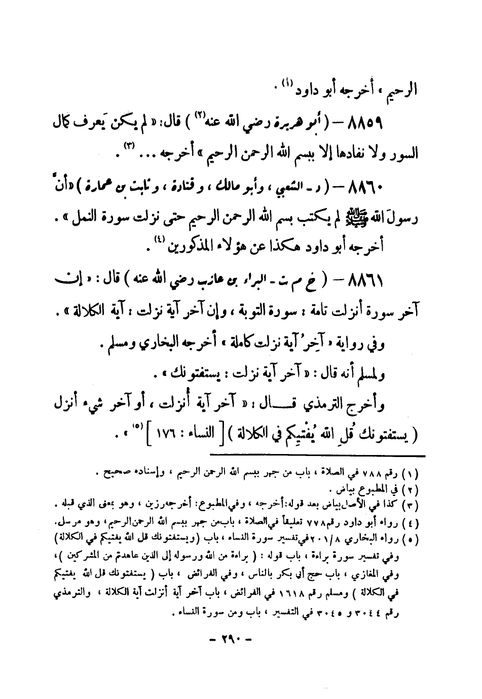8860 - (د) الشعبي، وأبو مالك، وقتادة، وثابت بن عمارة «أنَّ رسولَ الله - صلى الله عليه وسلم- لم يكتب بسم الله الرحمن الرحيم، حتى نزلت سورة النمل» . أخرجه أبو داود هكذا عن هؤلاء المذكورين (¬1) .