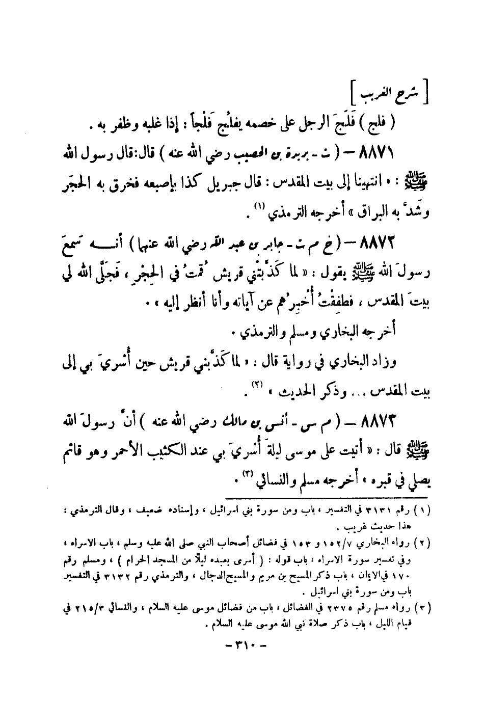 8872 - (خ م ت) جابر بن عبد الله - رضي الله عنهما - أنه سمعَ رسولَ الله - صلى الله عليه وسلم- يقولُ: «لما كَذَّبتني قريش قُمتُ في الحِجْرِ، فَجَلَّى الله لي بيتَ المقدس، فطفِقْت أخبرهم عن آياته وأنا أنظر إليه» . أخرجه البخاري ومسلم والترمذي.