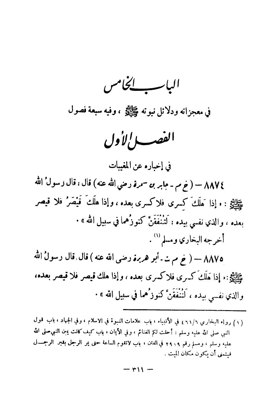 8875 - (خ م ت) أبو هريرة - رضي الله عنه - قال: قال رسولُ الله - صلى الله عليه وسلم-: «إذا هَلَكَ كسرى فلا كسرى بعده، وإذا هلك قيصر فلا قيصر بعده، والذي نفسي بيده، لَتُنْفَقَنَّ كنوزهما في سبيل الله» . -[312]-