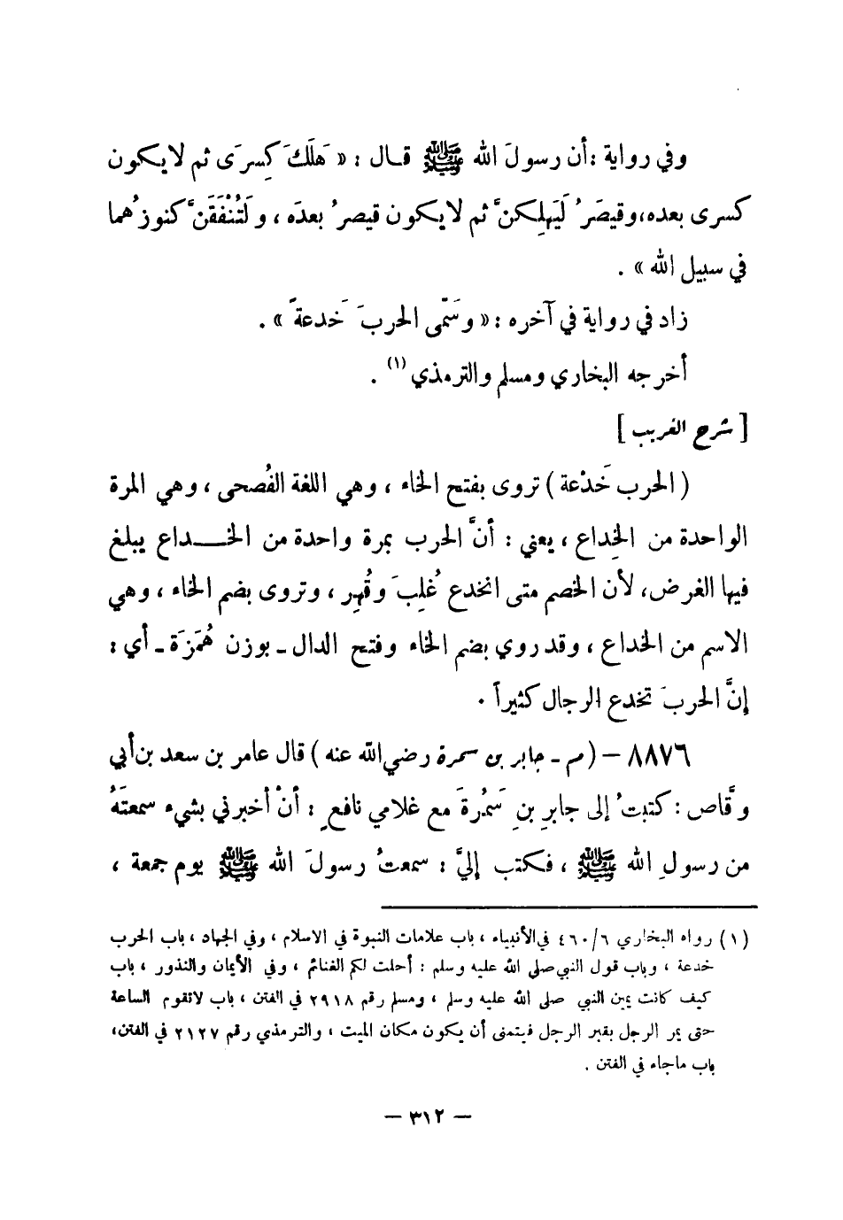 8876 - (م) جابر بن سمرة - رضي الله عنه - قال عامر بن سعد بن أبي وقاص: كتبت إلى جابر بن سَمُرة مع غُلامي نافع: أن أخبرني بشيء سمعتَهُ من رسول الله - صلى الله عليه وسلم-. فكتب إليَّ: «سمعتُ رسول الله - صلى الله عليه وسلم- يوم جمعة، -[313]- عَشِيَّةَ رُجَمَ الأسلميَّ، قال: لا يزال الدين قائماً حتى تقوم الساعة، أو يكون عليكم اثنا عشر خليفة، كُلُّهم من قريش، وسمعته يقول: عُصَيْبَة من المسلمين يفتتحون البيت الأبيض: بيتَ كِسرى - أو آل كِسرى - وسمعته يقول: إنَّ بين يدي الساعة كذَّابين، فاحذروهم، وسمعته يقول: إذا أعطى الله أحدَكم خَيْراً فليبدأْ بنفسه وأهلِ بيته، وسمعته يقول: أنا الفَرَط على الحوض» .