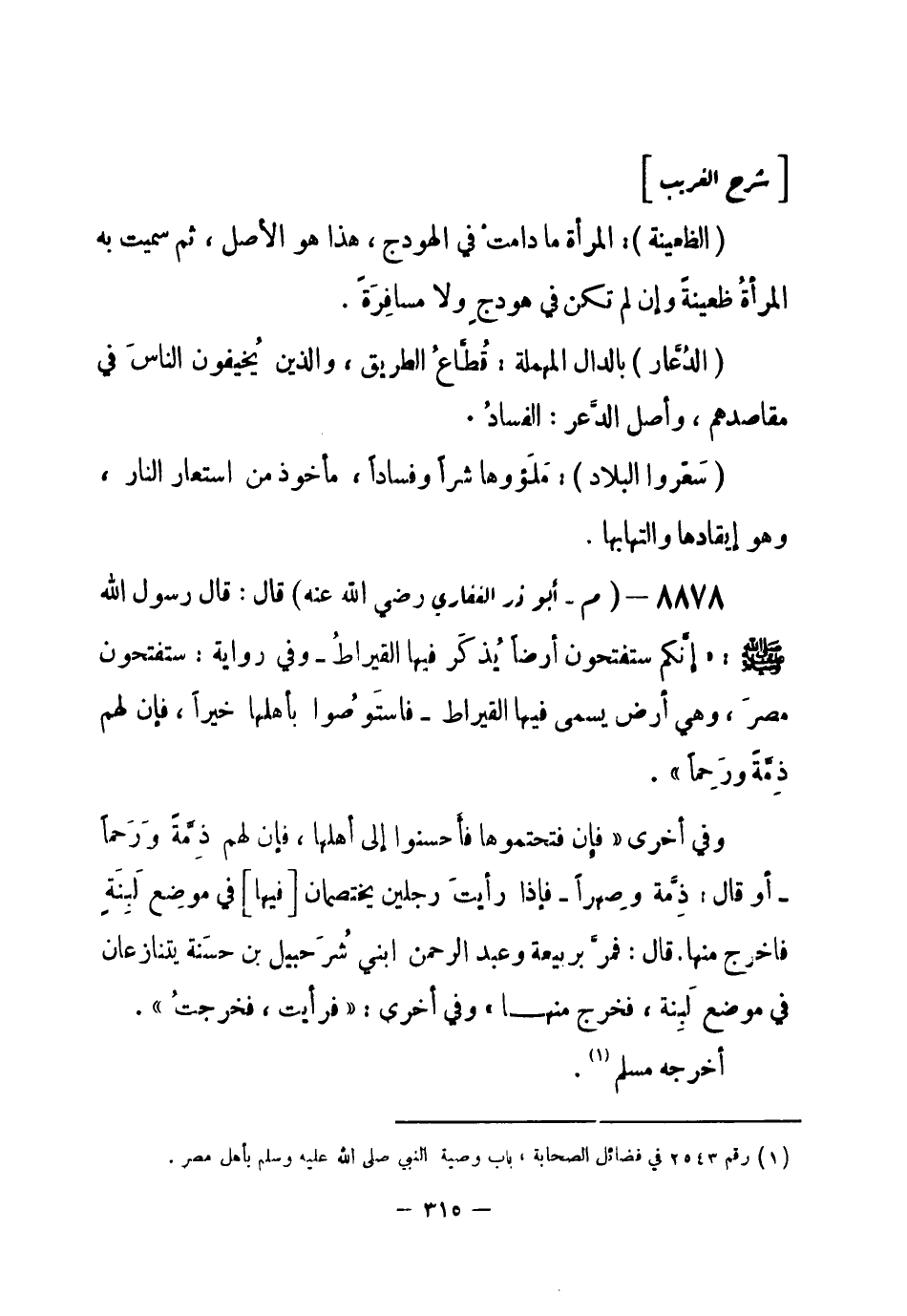 وفي أخرى «فإن فتحتموها فأحسنوا إلى أهلها، فإن لهم ذِمَّة ورَحماً - أو قال: ذِمَّة وصِهراً - فإذا رأيتَ رجلين يختصمان [فيها] في موضِع لَبِنَة فاخرج منها، قال: فمرَّ بربيعة وعبد الرحمن ابني شُرَحبيل بن حَسَنة يتنازعان في موضع لَبِنَة، فخرج منها» وفي أخرى: «فرأيت، فخرجتُ» . أخرجه مسلم (¬1) .