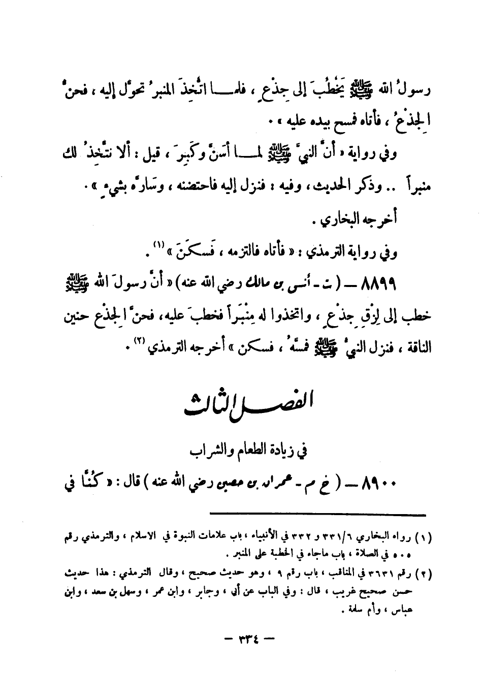8899 - (ت) أنس بن مالك - رضي الله عنه - «أنَّ رسولَ الله - صلى الله عليه وسلم- خطب إلى لِزْقِ جِذْعِ، واتخذوا له مِنْبَراً يخطب عليه، فحنَّ الجذع حنين الناقة، فنزل النبي - صلى الله عليه وسلم- فمسَّهُ، فسكن» أخرجه الترمذي (¬1) .