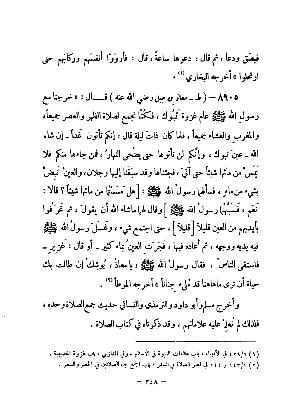 8905 - (ط) معاذ بن جبل - رضي الله عنه - قال: «خرجنا مع رسول الله - صلى الله عليه وسلم- عام غزوة تَبُوك، فكنا نجمع لصلاة الظهر والعصر جميعاً، والمغرب والعشاء جميعاً، فلما كان ذاتَ ليلة قال: إنكم تأتون غَداً - إن شاء الله - عينَ تبوك، وإنكم لن تأتوها حتى يضْحى النهار، فمن جاءها منكم فلا يَمَسَّ من مائها شيئاً حتى آتي، فجئناها وقد سبَقَنا إليها رجلان، والعينُ تَبِضُّ بشيء من ماء، فسألهما رسول الله - صلى الله عليه وسلم-: [هل مَسَسْتُما من مائها شيئاً؟ قالا: نَعَمْ، فَسَبَّهُمَا رسولُ الله - صلى الله عليه وسلم-] وقال لهما ما شاء الله أن يقول، ثم غَرَفُوا بأيديهم من العين قليلاً [قليلاً] ، حتى اجتمع شيء، وغَسَلَ رسول الله - صلى الله عليه وسلم- فيه يديه ووجهه، ثم أعاده فيها، فَجَرَتِ العينُ بماء كثير - أو قال: غَزِير - فاستسقى الناسُ، فقال رسول الله - صلى الله عليه وسلم-: يا معاذُ، يُوشِكُ إن طالت بك حياة أن ترى ما هاهنا قد مُلئ جناناً» أخرجه الموطأ (¬1) .