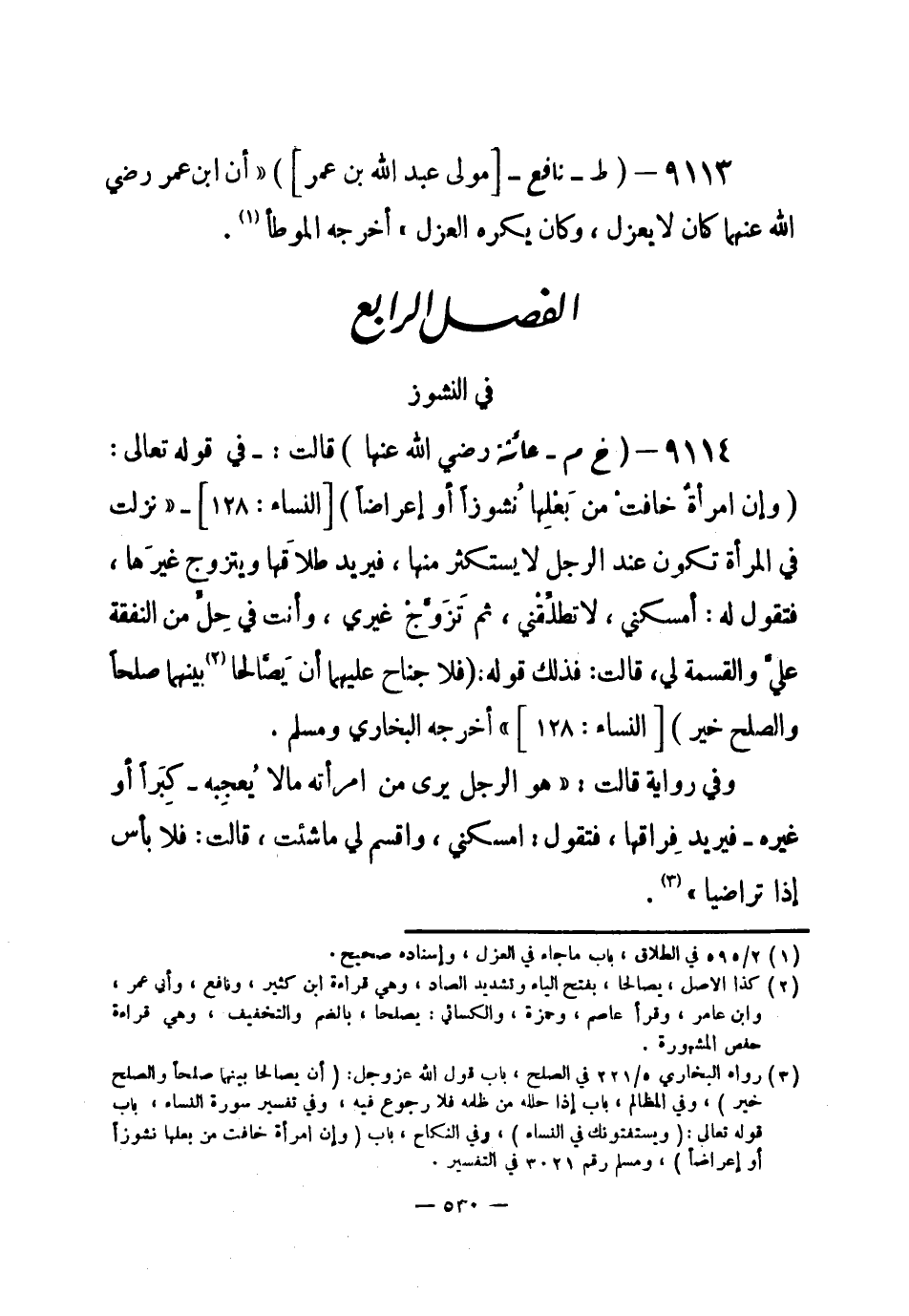 9114 - (خ م) عائشة - رضي الله عنها - قالت: - في قوله تعالى: {وإن امرأةٌ خافتْ من بَعْلِهَا نُشوزاً أو إعراضاً} [النساء: 128]- «نزلت في المرأة تكون عند الرجل لا يستكثر منها، فيريد طلاقَها ويتزوج غيرَها، فتقول له: أمسكني، لا تطلِّقْني، ثم تَزَوَّج غيري، وأنت في حِلٍّ من النفقة عليَّ والقسمة لي، قالت: فذلك قوله: {فلا جناح عليهما أن يصَّالحا (¬1) بينهما صلحاً والصلح خير} [النساء: 128] » أخرجه البخاري ومسلم.