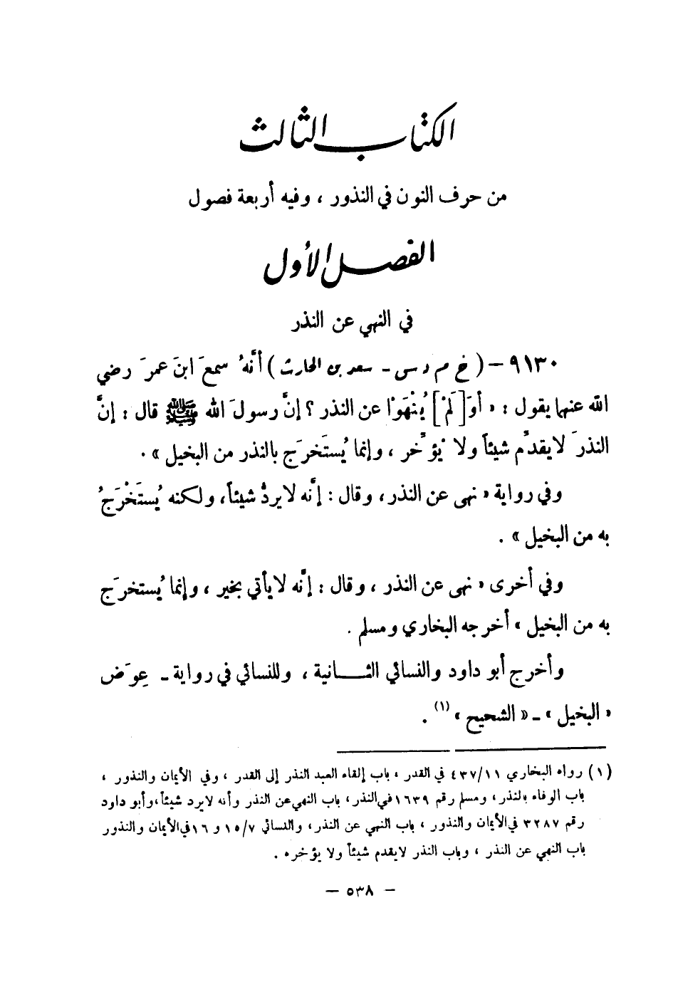 (¬1) رواه البخاري 11 / 437 في القدر، باب إلقاء العبد النذر إلى القدر، وفي الأيمان والنذور، باب الوفاء بالنذر، ومسلم رقم (1639) في النذر، باب النهي عن النذر وأنه لا يرد شيئاً، وأبو داود رقم (3287) في الأيمان والنذور، باب النهي عن النذر، والنسائي 7 / 15 و 16 في الأيمان والنذور باب النهي عن النذر، وباب النذر لا يقدم شيئاً ولا يؤخره.