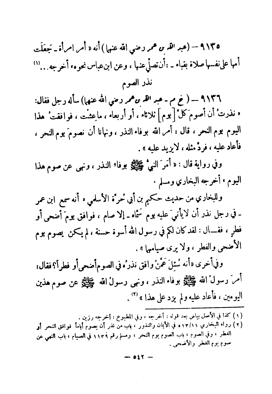 9136 - (خ م) عبد الله بن عمر - رضي الله عنهما -: سأله رجل فقال: «نذرتُ أن أصومَ كلَّ [يوم] ثلاثاء، أو أربعاء، ما عِشْت، فوافقتُ هذا اليوم يوم النحر، قال: أمر الله بوفاء النذر، ونهانا أن نصومَ يوم النحر، فأعاد عليه، فردَّ مثله، لا يزيد عليه» .