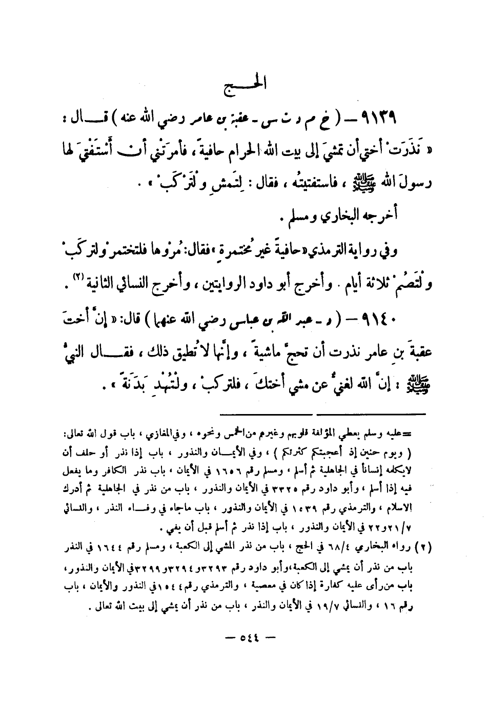 9139 - (خ م د ت س) عقبة بن عامر - رضي الله عنه - قال: «نَذَرَتْ أختي أن تمشيَ إلى بيت الله الحرام حافية، فأمرَتْني أن أسْتَفْتيَ لها رسولَ الله - صلى الله عليه وسلم- فاستفتيتُه، فقال: لِتَمشِ ولْتَرْكَبْ» . أخرجه البخاري ومسلم.