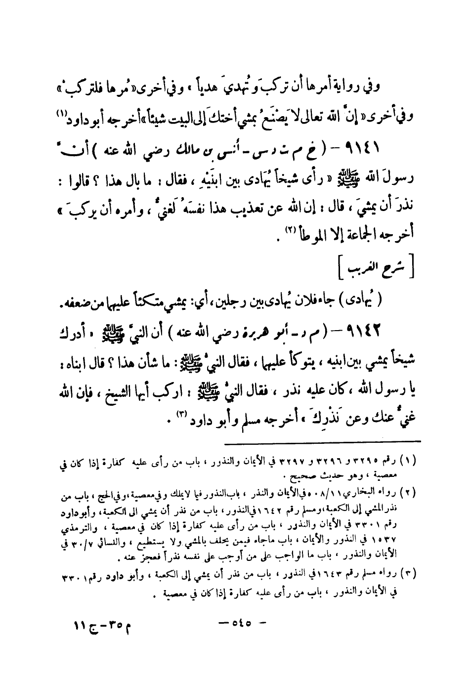9141 - (خ م ت د س) أنس بن مالك - رضي الله عنه - أنَّ رسولَ الله - صلى الله عليه وسلم- «رأى شيخاً يُهَادى بين ابنَيْهِ، فقال: ما بال هذا؟ قالوا: نذرَ أن يمشيَ، قال: إن الله عن تعذيب هذا نفسَهُ لَغنيٌّ، وأمره أن يركب» أخرجه الجماعة إلا الموطأ (¬1) .