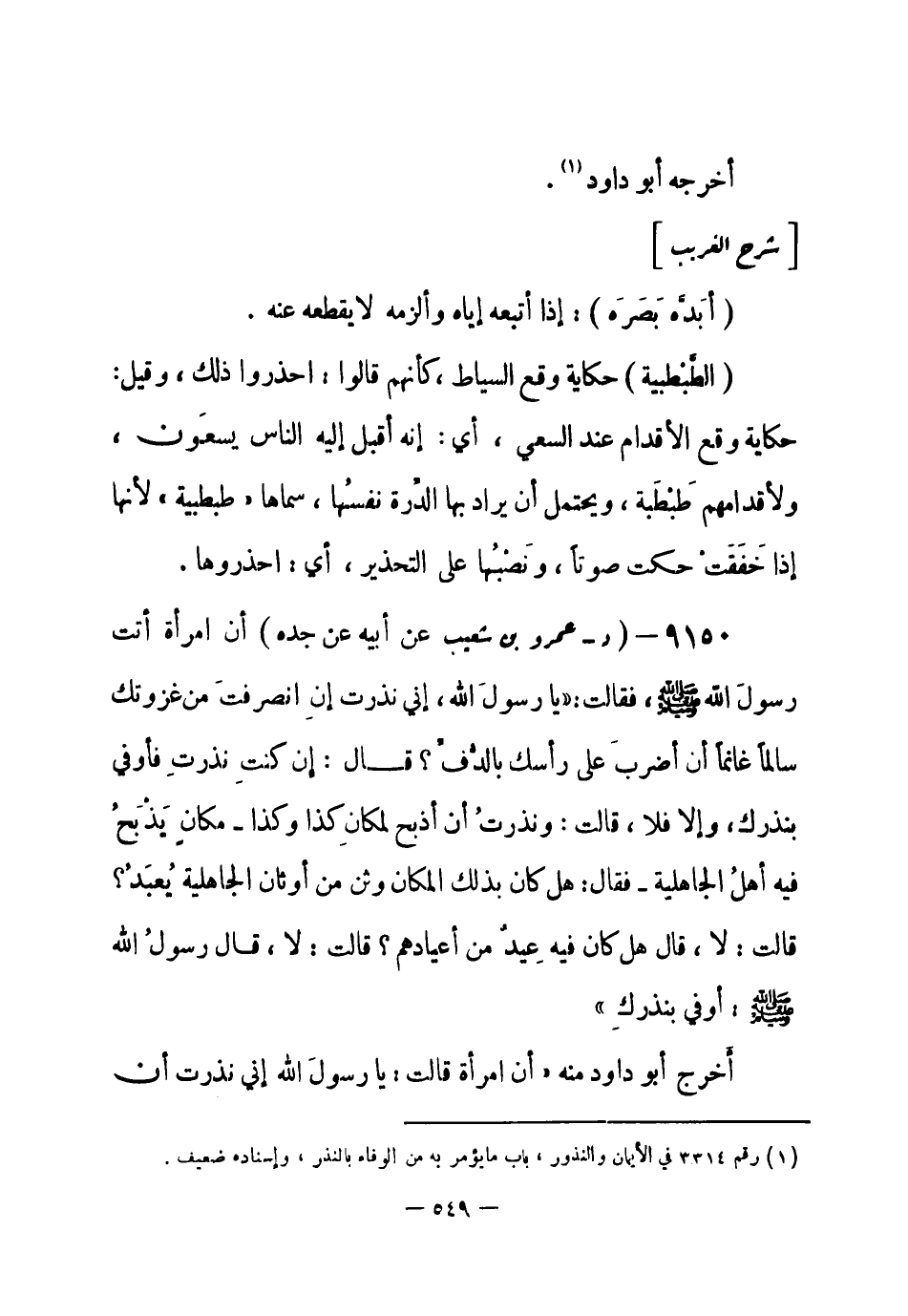 9150 - (د) عمرو بن شعيب عن أبيه عن جده أن امرأة أتت رسولَ الله - صلى الله عليه وسلم- فقالت: «يا رسولَ الله، إني نذرت إن انصرفتَ من غزوتك سالماً غانماً أن أضربَ على رأسك بالدُّفِّ؟ قال: إن كنتِ نذرتِ فأوفي بنذرك، وإلا فلا، قالت: ونذرتُ أن أذبح لمكانِ كذا وكذا - مكانٍ يَذْبَحُ فيه أهلُ الجاهلية - فقال: هل كان بذلك المكان وثن من أوثان الجاهلية يُعبَدُ؟ قالت: لا، قال: هل كان فيه عِيدٌ من أعيادهم؟ قالت: لا، قال رسولُ الله - صلى الله عليه وسلم-: أوفِ بنذركِ» .