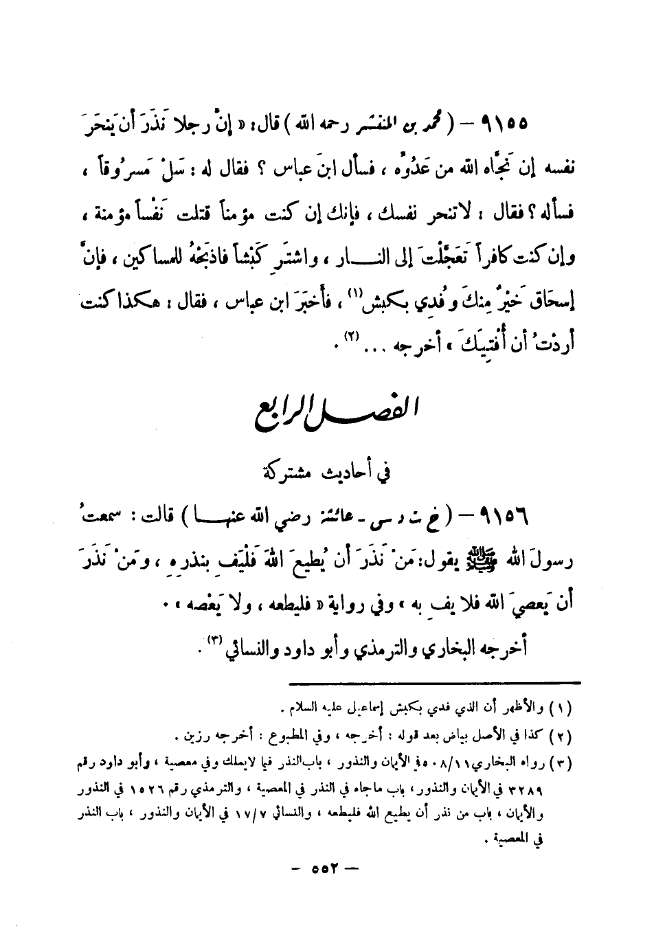 (¬1) رواه البخاري 11 / 508 في الأيمان والنذور، باب النذر فيما لا يملك وفي معصية، وأبو داود رقم (3289) في الأيمان والنذور، باب ما جاء في النذر في المعصية، والترمذي رقم (1526) في النذور والأيمان، باب من نذر أن يطيع الله فليطعه، والنسائي 7 / 17 في الأيمان والنذور، باب النذر في المعصية.