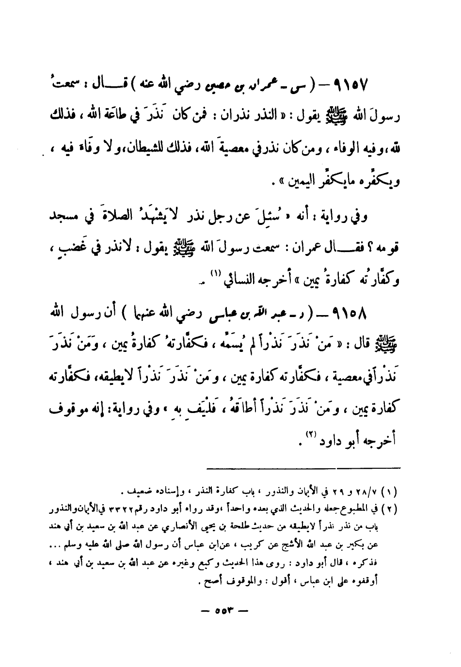 9157 - (س) عمران بن حصين - رضي الله عنه - قال: سمعتُ رسولَ الله - صلى الله عليه وسلم- يقول: «النذر نذران: فمن كان نَذَرَ في طاعَة الله، فذلك لله وفيه الوفاء، ومن كان نذر في معصية الله، فذلك للشيطان ولا وفَاء فيه، ويكفِّره ما يكفِّر اليمين» .