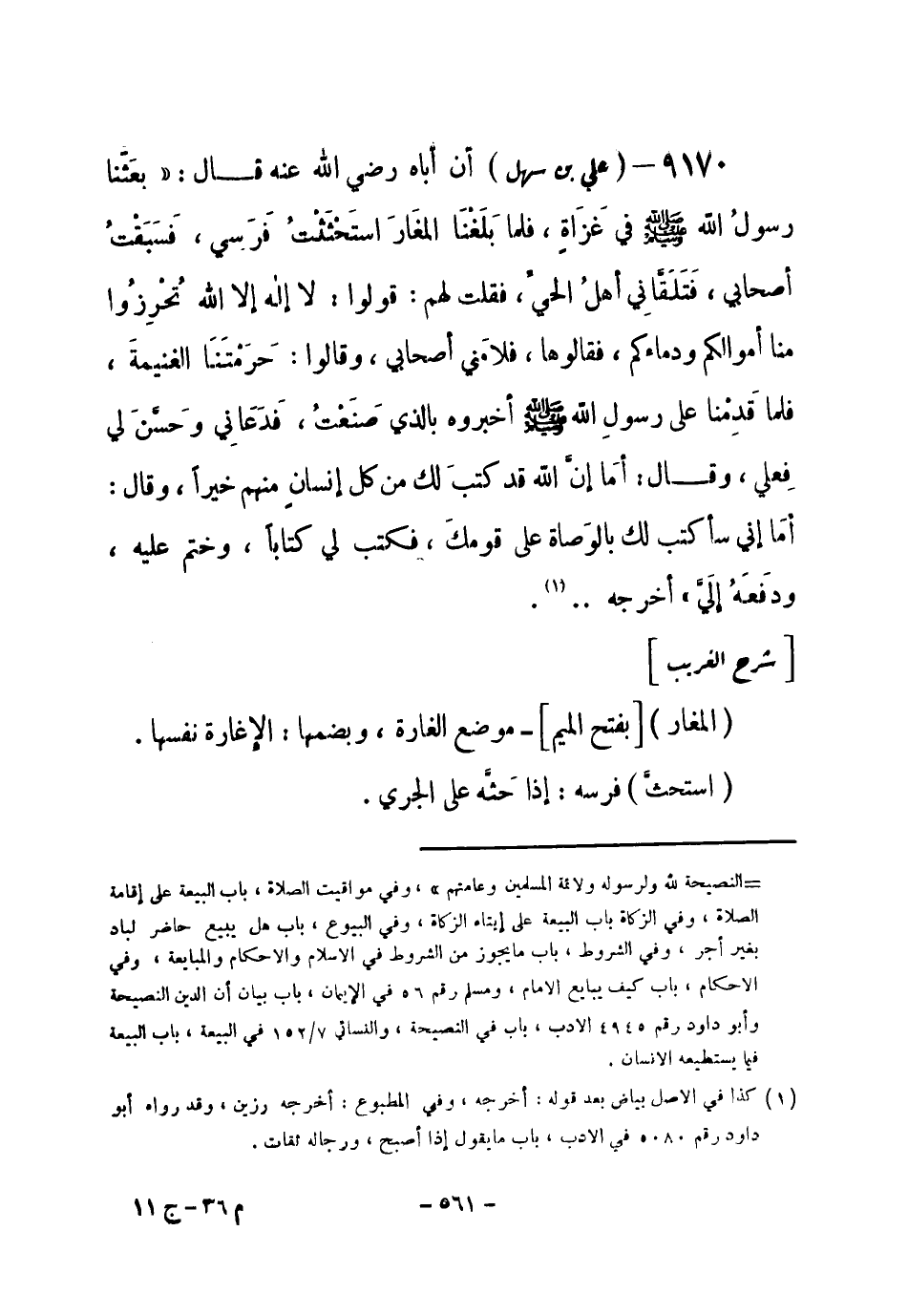 9170 - () علي بن سهل أن أباه - رضي الله عنه - قال: «بعثنا رسول الله - صلى الله عليه وسلم- في غَزَاة، فلما بَلَغْنَا المغَارَ استَحْثَتْتُ فَرَسِي، فَسَبَقْتُ أصحابي، فَتَلَقَّانِي أهلُ الحيِّ، فقلت لهم: قولوا: لا إله إلا الله تُحْرِزُوا منا أموالكم ودماءكم، فقالوها، فلامَني أصحابي، وقالوا: حَرَمْتَنَا الغنيمة، فلما قَدِمْنا على رسول الله - صلى الله عليه وسلم- أخبروه بالذي صَنَعْتُ، فَدَعَانِي وحَسَّنَ لي فِعلي، وقال: أمَا إن الله قد كتبَ لك من كل إنسان منهم خيراً، وقال: أمَا إني سأكتب لك بالوَصاة على قومكَ، فكتب لي كتاباً، وختم عليه، ودفَعَهُ إِلَيَّ» أخرجه ... (¬1) .